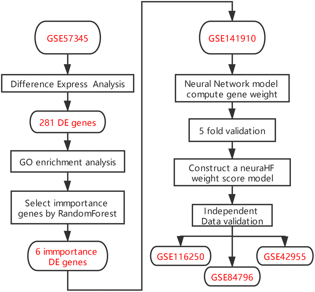 There are several limitations associated with the diagnostic techniques for HF commonly used in clinics. The levels of brain natriuretic peptide/N-terminal-proB-type natriuretic peptide may also be elevated in various non-HF diseases, such as pulmonary hypertension, cirrhotic ascites, acute or chronic renal failure, infection, and inflammation [8], but normal in patients with HFpEF [7]. Echocardiography, which is another commonly used technique for the evaluation of cardiac function, relies more on the individual operation proficiency and diagnostic experience of specialists, making the examination poorly reproducible. Moreover, it is difficult to identify patients with HFpEF by simply measuring the EF value [7]. Therefore, it is necessary to develop new diagnostic models to supplement these current methods. The rapid development of second generation sequencing in recent years facilitates the identification of marker genes associated with a variety of diseases, providing a solid basis for establishing new gene-related diagnostic models of HF. In this study, we screened differentially expressed genes (DEGs) between HF and normal myocardium samples in the Gene Expression Omnibus (GEO) database. On the basis of these DEG data, we used the random forest algorithm to identify the key genes expressed in HF. We then input these key genes in artificial neural networks to construct a genetic diagnostic model of HF (See analysis process in Figure 1).