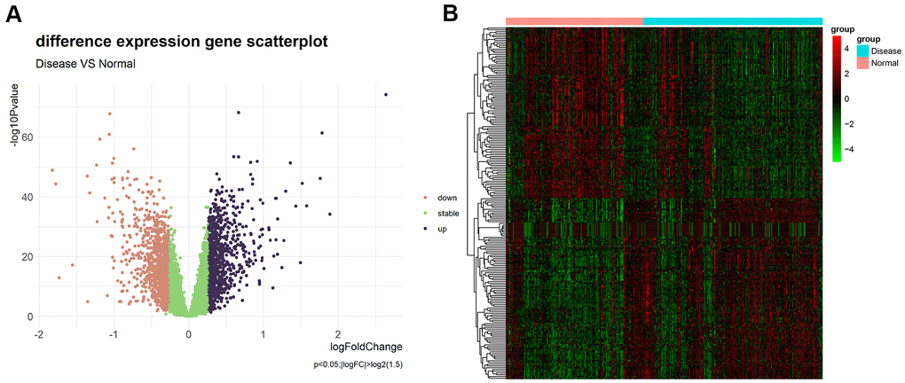 Differential expression analysis was performed based on the chip dataset GSE57345 to screen for DEGs. The GSE57345 dataset contained 313 samples, including 136 normal and 177 HF disease samples. Next, the limma package was used to identify DEGs between the HF samples of this chip dataset and the normal control samples through the Bayesian test. The results of the DEGs are shown in the volcano graph (Figure 2A) and heatmap (Figure 2B). Based on fold change values of >1.5 and significance threshold of P <0.05, we identified 281 significant DEGs related to HF diseases by the screen (Supplementary File 1).