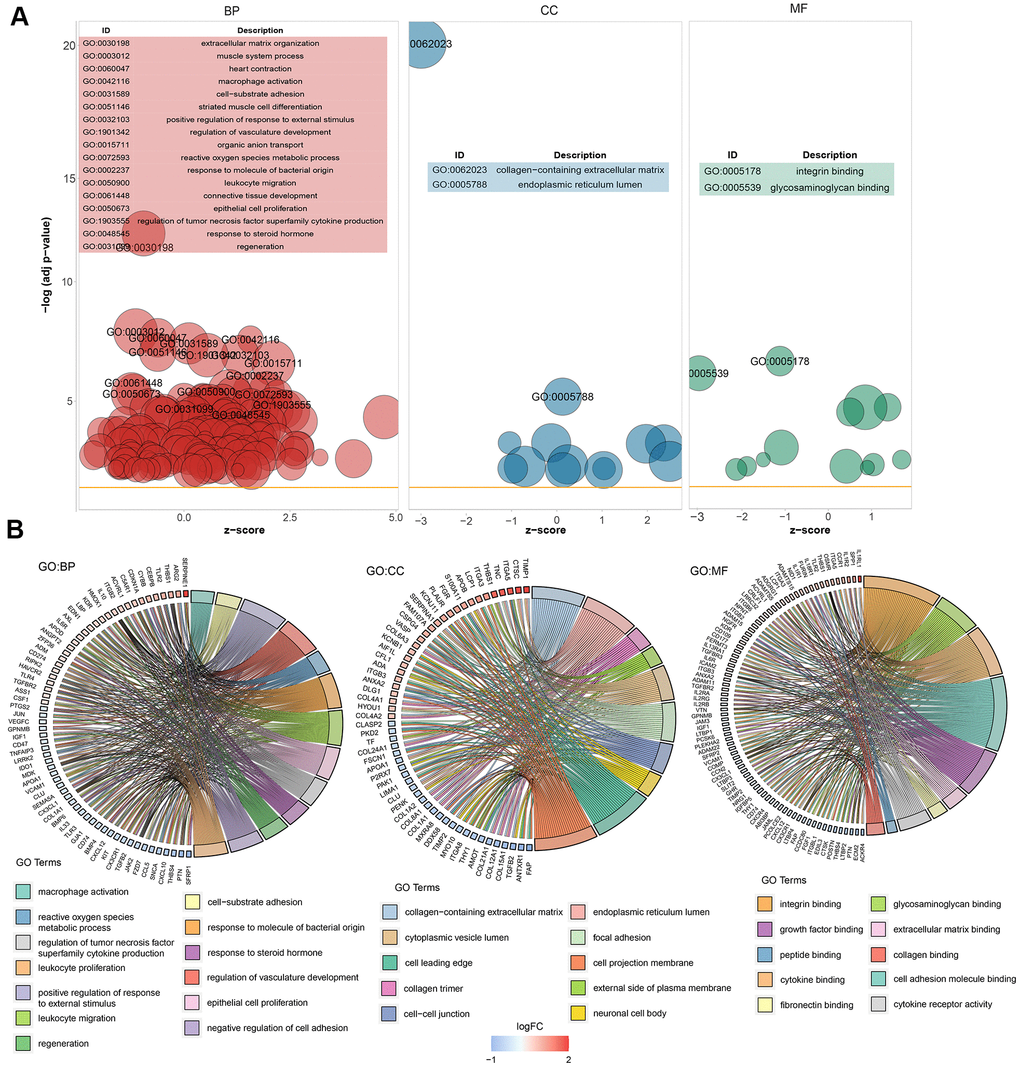 GO enrichment analysis was performed on the 281 significant DEGs using the clusterProfiler package. The Benjamini–Hochberg correction method was used, with the thresholds set at a P value of <0.01 and a Q value of <0.01. To avoid redundancy in the GO enrichment results, we performed deduplication on the GO enrichment terms and eliminated terms with a gene overlap of >0.75 (Supplementary File 2). Figure 3 shows the analysis results of three aspects of GO enrichment, including biological processes, cellular components, and molecular function. Figure 3A shows the GO enrichment results of all three classifications (only the GO term results of –log10(adj P)>5 are shown). Among the results, the related biological processes involved in HF include extracellular matrix organization, heart contraction, macrophage activation, and cell–substrate adhesion. The cellular components involved include collagen-containing extracellular matrix. The molecular functions included integral binding and other important functions. Figure 3B shows part of the GO enriched terms and the significant DEGs involved. We also performed KEGG pathway enrichment analysis on the DEGs, as shown in Supplementary Figure 1, which shows the results of significant enriched biological pathways involved and the corresponding DEGs.