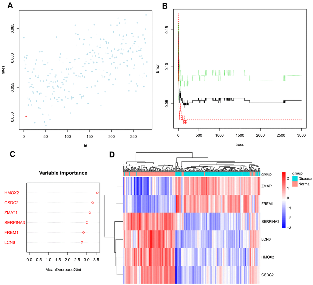 The randomForest software package was used to construct a random forest model for the DEGs [36]. First, the average model miscalculation rate of all genes based on out-of-band data was calculated. The best variable number for the binary tree in the node was set as 6, and 2000 was chosen as the best number of trees contained in the random forest. Next, a random forest model was constructed and the dimensional importance value from the random forest model was obtained using the decreasing accuracy method (Gini coefficient method). The genes with an importance value greater than 2 and ranked in the top six were chosen as the disease specific genes for the subsequent model construction. The software package pheatmap was used to reclassify the unsupervised hierarchical clusters of the six important genes in the GSE57345 dataset and draw a heat map.