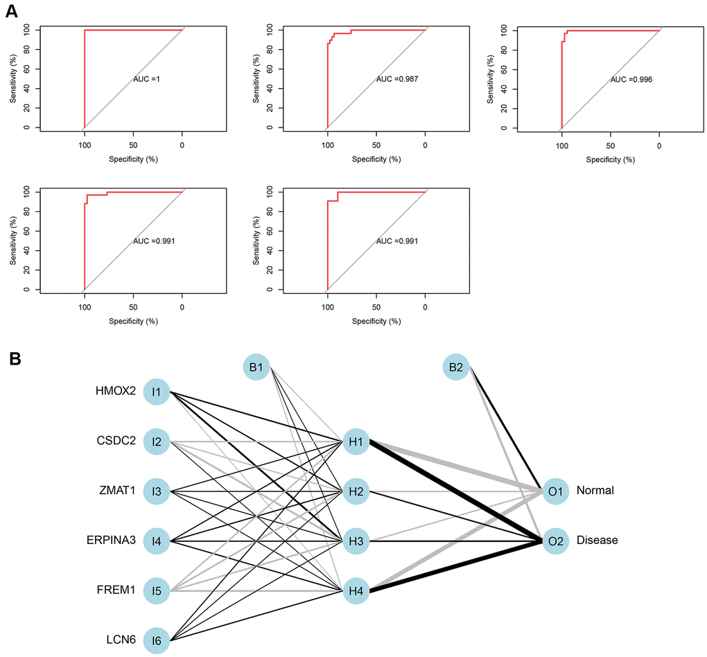 Another dataset GSE141910 was selected for neural network model training. After the data was normalized to the maximum and minimum values, the R software package neuralnet (version 1.44.2) [37] was used to construct an artificial neural network model of the important variables. Four hidden layers were set as the model parameters to construct a classification model of HF diseases through the obtained gene weight information. In this model, the sum of the product of the weight scores multiplied by the expression levels of the important genes was used as the disease classification score. Caret (version 6.0) [38] was used to perform a five-fold cross-validation of the model results, the confusion matrix function was used to calculate the results of the five-fold cross-validation to obtain the model accuracy results, and pROC [39] software package was used to calculate the verification results of AUC classification performance.