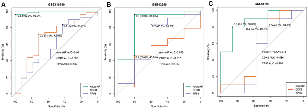 Figure 6 shows a comparison of the three scores of the three independent verification datasets. In the GSE116250 dataset (Figure 6A), the AUC of neuraHF, CD8K, and TP53 was 0.991, 0.683, and 0.597, respectively. neuraHF had a sensitivity of 100% and a specificity of 96%. In the GSE42955 dataset (Figure 6B), the AUC of neuraHF, CD8K, and TP53 was 0.858, 0.517, and 0.65, respectively. neuraHF had a sensitivity of 80% and a specificity of 95.8%. In the verification results of GSE84796 (Figure 6C), the AUC of neuraHF, CD8K, and TP53 was 0.871, 0.586, and 0.486, respectively. The sensitivity and specificity of neuraHF were 85.7% and 80%, respectively.