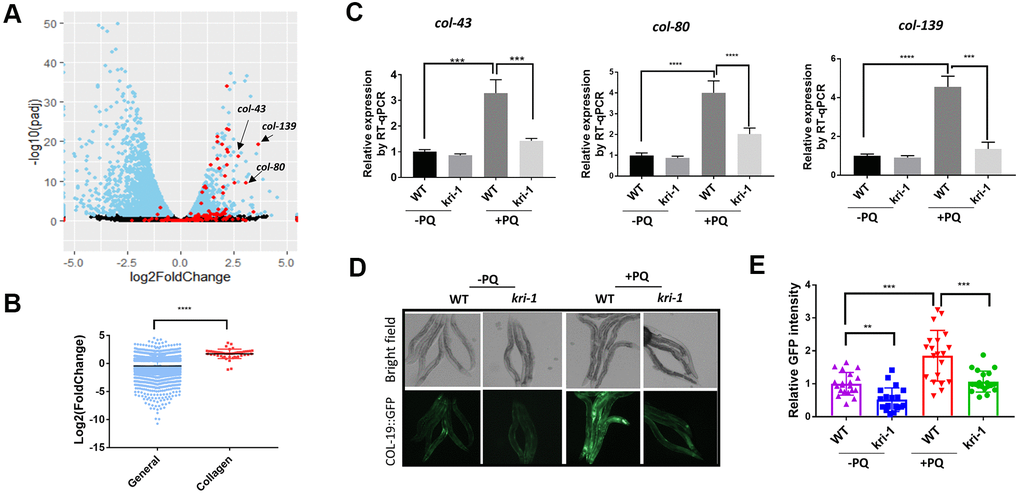 We were interested to know if our findings in C. elegans would be conserved in human cells. In C. elegans, we observed that even without paraquat treatment, kri-1 mutation had already reduced collagen gene expression (Figure 1D, 2C), suggesting that kri-1 is also required for the basal collagen expression under normal condition. This prompted us to investigate into the public GEO dataset deposited at National Center for Biotechnology Information (NCBI). The GSE85657 contains RNAseq data of KRIT1 (human homolog of KRI-1) knockdown in mouse primary brain microvascular endothelial cells [36]. We took advantage of this resource and did a Volcano Plot of 11653 transcripts including 26 collagen genes. We found that in the KRIT1-depleted cells, 22 out of 26 collagen genes were decreased as compared to those in WT control (Figure 5A, red). The mean expression of all the 26 collagen genes was -0.71 in log2 fold change, which equals to 0.61 fold change as compared to those in WT control. These results support our findings in C. elegans, suggesting that KRIT1 could function in a conserved manner in human cells.