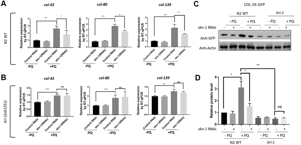 The oxidative stress responsive transcription factor SKN-1 positively regulates collagen transcription to delay aging in C. elegans [33]. We wondered if KRI-1 would regulate SKN-1 to promote collagen gene transcription in response to paraquat treatment. First, we knocked down SKN-1 transcription by RNAi and asked if such treatment would block paraquat from inducing collagen transcription. Worms were fed HT115 bacteria expressing double-stranded RNA targeting skn-1 gene from L1 stage to day-1 of adulthood in the presence or absence of 75 μM paraquat. RT-qPCR demonstrated that the transcription of col-43, col-80 and col-139 were all reduced by skn-1 knockdown (Figure 2A). skn-1 knockdown in kri-1 mutant did not further decrease the expression of above collagen genes (Figure 2B), suggesting that KRI-1 and SKN-1 function in the same pathway to regulate collagen transcription. By using Western blot to detect GFP levels, we further confirmed the genetic interaction between KRI-1 and SKN-1 on collagen gene transcription; paraquat-induced COL-19:GFP up-regulation was blunted by SKN-1 knockdown and largely blocked by kri-1 knockout, but was not additively affected by both (Figure 2C, 2D).