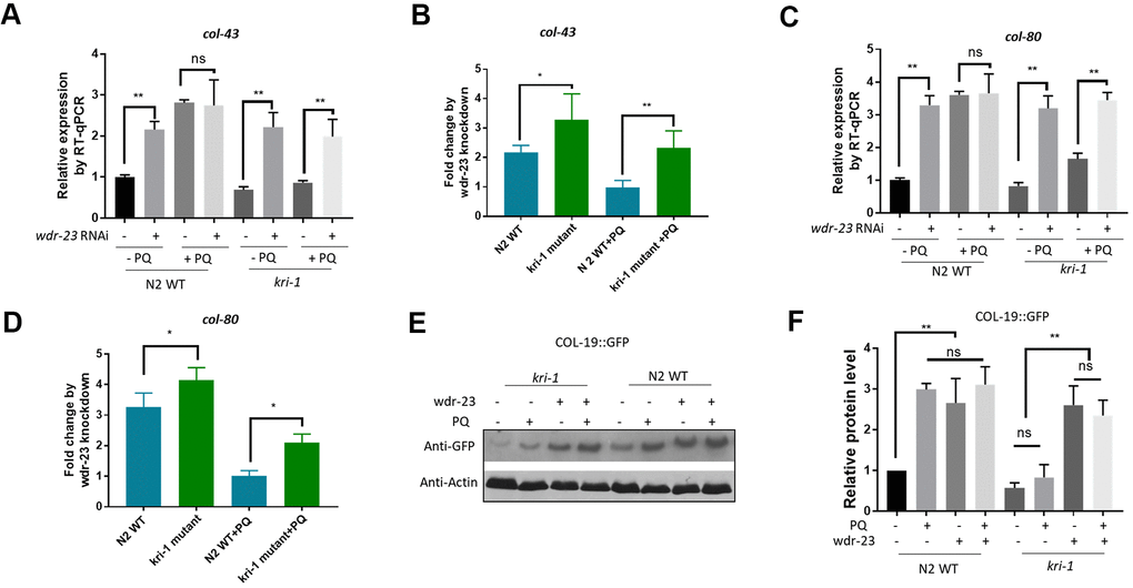 We next asked if SKN-1 hyperactivation could be epistatic to kri-1 mutant. WDR-23 is homologous to human KEAP1, a negative regulator of Nrf2; knocking down wdr-23 expression constitutively activates SKN-1 in C. elegans [34]. We knocked down wdr-23 from L1 in the presence and absence of 75 μM paraquat. Indeed, wdr-23 knockdown significantly increased the transcription of col-43 and col-80 in both WT and kri-1 mutant worms (Figure 3A, 3C). The normalized fold changes were higher in kri-1 mutant (Figure 3B, 3D) as compared to N2 WT, suggesting that Nrf2 are epistatic to KRI-1 in collagen transcription. Further supporting this result, western blot analysis showed that wdr-23 knockdown increased COL-19::GFP levels regardless of paraquat treatment in kri-1 mutant (Figure 3E, 3F), suggesting that KRI-1 regulates collagen transcription at least partly through SKN-1.