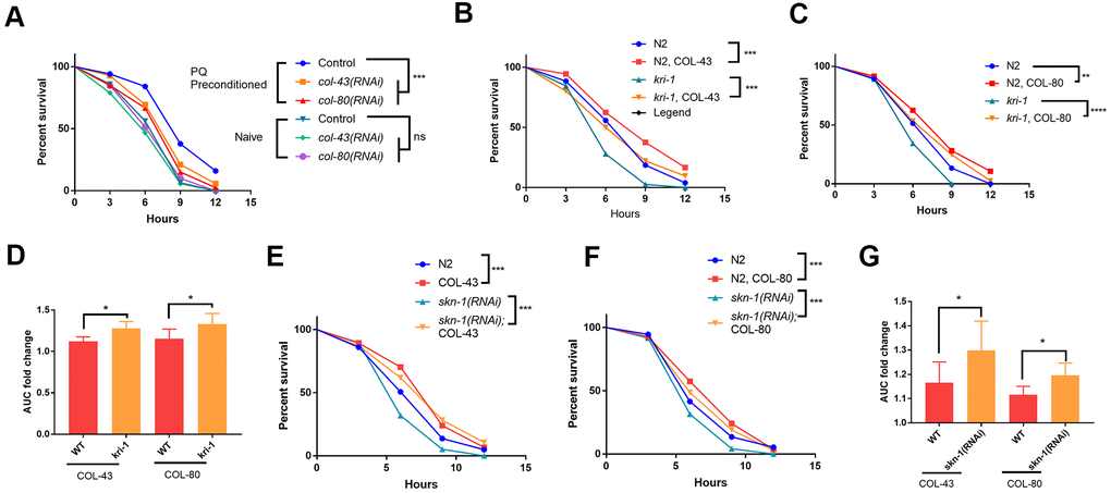 Next, we tested if collagen overexpression would rescue the sensitive phenotype of kri-1 and skn-1 mutants to paraquat. Interestingly, although there are many collagen genes, overexpressing single collagen gene has been shown to promote longevity in C. elegans [33]. By using transgenic worms expressing high copy number of extrachromosomal collagen genes (Supplementary Figure 2), we showed that COL-43 and COL-80 overexpression significantly increased the resistance to paraquat toxicity in all WT kri-1 mutant and skn-1(RNAi) animals (Figure 4B, 4C, 4E, 4F). Consistent with a previous study [32], kri-1 mutant and skn-1(RNAi) animals were sensitive to paraquat, but such sensitivity was partly rescued by COL-43 and COL-80 overexpression. By measuring the area under the curve (AUC) and calculated the fold increase, we showed that both collagen overexpression preferentially increased paraquat tolerance in kri-1 and skn-1(RNAi) animals as compared to WT (Figure 4D, 4G), further confirming the specific roles of KRI-1 and SKN-1 in the regulation of collagen transcription.