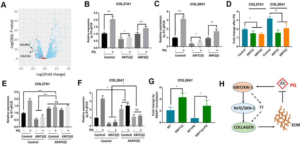 In human lung fibroblast cell line MRC-5, paraquat has been shown to increase collagen transcription [21]. We asked if KRIT1 and Nrf2 (human homolog of SKN-1) would be required for paraquat to increase collagen gene transcription. First, we knocked down KRIT1 and NRF2 individually, then treated MRC-5 cells with 300 μM paraquat for 48 hours as determined by the previous paper [21]. We extracted mRNA for RT-qPCR analysis of 2 top-ranked collagen genes COL28A1 and COL27A1 in Figure 5A (Arrows). COL28A1 and COL27A1 belong to their distinct collagen types, XXVIII and XXVII, respectively. COL28A1 belongs to a class of collagens containing von Willebrand factor type A (VWFA) domains and could be involved in collagen chain trimerization and degradation of the extracellular matrix [37]. COL27A1 is related to the "fibrillar" class of collagens and may play a role in development of the skeleton [38, 39]. Interestingly, they have been predicted to be functional partners based on STRING, the protein-protein interaction network. Consistent with our study in C. elegans, COL28A1 and COL27A1 expression were elevated after paraquat treatment in MRC-5 cells (Figure 5B, 5C). Interestingly, KRIT1 knockdown reduced basal expression of both COL28A1 and COL27A1, consistent with the RNAseq data shown in Figure 1A. Although paraquat still increased collagen gene expression in KRIT1- and NRF2-knockdown cells, the fold change was significantly reduced (Figure 5D), suggesting specific roles of KRIT1 and Nrf2 in paraquat toxicity.