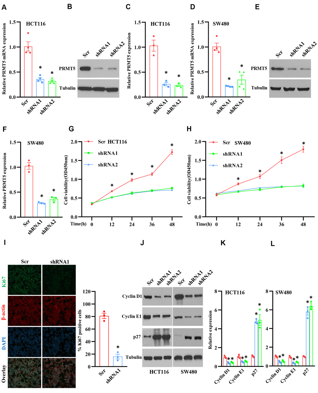In order to explore the role of PRMT5 in human colorectal cancer, we generated the PRMT5 stable knockdown cell lines using lentivirus containing PRMT5 shRNAs and Scramble (Scr). As shown in Figure 2A, 2D, PRMT5 mRNA expression level was significantly reduced in HCT116 and SW480 cells compared to Scr. Western blot analysis further showed that PRMT5 protein expression level was distinctly impaired in HCT116 and SW480 cells as well (Figure 2B, 2C, 2E, 2F). Subsequently, those PRMT5 depletion cell lines were applied to cell viability assay. As shown in Figure 2G, 2H, the cell viability was dramatically prevented at different time points when PRMT5 was down-regulated in HCT1116 and SW480 cells. Moreover, we also assessed cell proliferation using ki67, a well-known cell proliferation marker. As shown in Figure 2I, ki67 positive cells were markedly reduced when PRMT5 is silenced in HCT116 cells. These results suggest that PRMT5 regulates colorectal cancer proliferation. Next, we asked if PRMT5 could control the cell cycle progression. In this regard, we detected the related cell cycle markers, including cyclin D1, cyclinE1, and cell cycle inhibitor p27. As shown in Figure 2J–2L, we found that cyclin D1 and cyclin E1 protein expression level was significantly lower in HCT116 and SW480 cells compared with Scr when PRMT5 is down-regulated. In contrast, the p27 protein expression was remarkably elevated in HCT116 and SW480 cells compared with Scr. Collectively, our findings indicate that PRMT5 control human colorectal cancer cell growth and cell cycle progression.