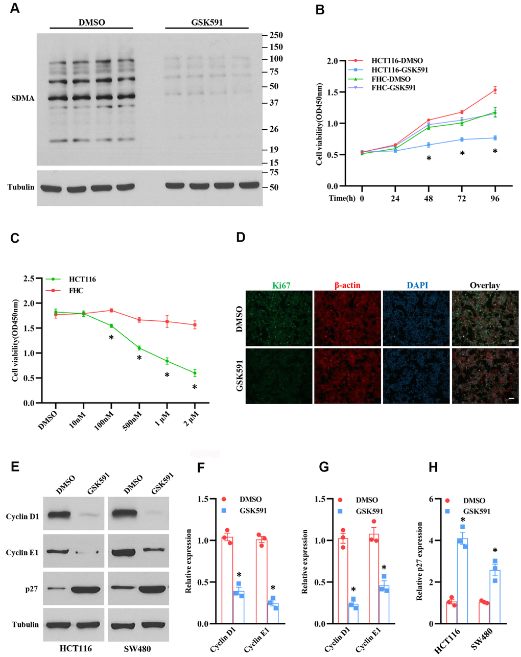 PRMT5 regulated gene expression and protein post-translational modification through methylation [10]. Therefore, the enzyme activity of PRMT5 plays a crucial role in the regulation of DNA and protein methylation. To further investigate the enzyme activity of PRMT5 was required or not for the colorectal cancer cell proliferation, we used GSK591, a PRMT5 specific inhibitor, to treat HCT116 cells, and the SDMA expression was assessed. As shown in Figure 3A, the SDMA expression level was almost diminished compared to the DMSO treatment, indicating that GSK591 completely blocked the enzyme activity of PRMT5. Next, we treated the HCT116 and FHC cells with GSK591, and the cell viability was monitored at different time points. As shown in Figure 3B, GSK591 distinctly prevented HCT116 cell growth compared with DMSO treatment. By contrast, GSK591 did not affect the cell growth of FHC cells. Furthermore, we found that GSK591 blocked HCT116 cell growth in a dose-dependent manner (Figure 3C). To further confirm our findings above, we performed immunostaining for ki67 in HCT116 cells treated with GSK591. As shown in Figure 3D, cell proliferation was almost suppressed in HCT 116 cells compared with DMSO treatment. These results indicate that the enzyme activity of PRMT5 is required for colorectal cancer cell proliferation. Next, we asked if the enzyme activity of PRMT5 could be required for the cell cycle progression. To this end, we evaluated the cyclin D1, cyclinE1, and p27 expression levels in HCT116 and SW480 cells treated with GSK591. As shown in Figure 3E–3H, cyclin D1 and cyclinE1 protein expression levels were almost completely blocked in HCT116 and SW480 cells compared with DMSO treatment. In contrast, the p27 protein expression was remarkably elevated in HCT116 and SW480 cells compared with DMSO treatment. Taken together, our results suggest that the enzyme activity of PRMT5 is required for colorectal cancer cell proliferation and cell cycle progression.