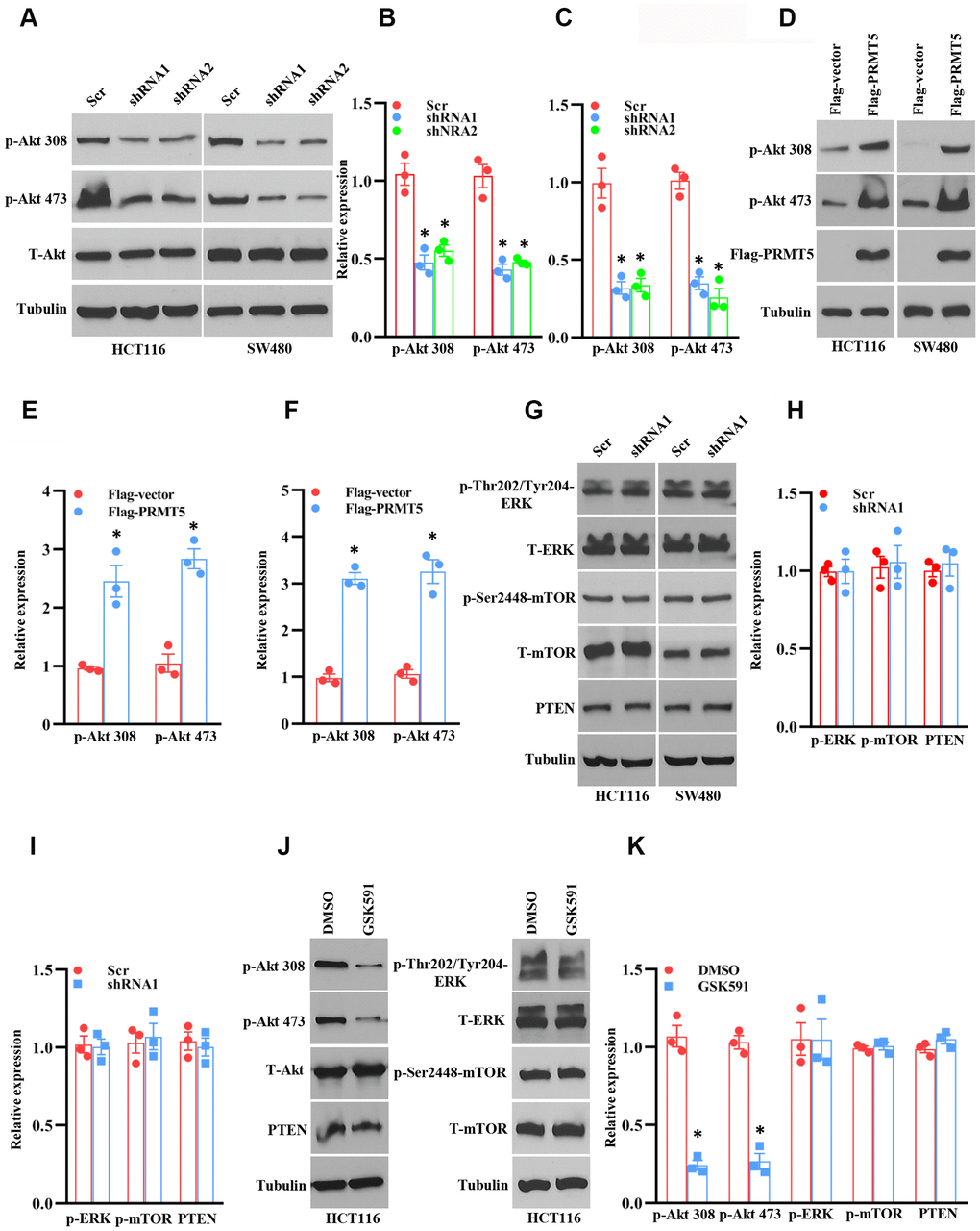 Next, we asked if the enzyme activity of PRMT5 is associated with Akt activation. In order to test this hypothesis, HCT116 cells were treated with PRMT5 inhibitor GSK591, and the phospho-Akt was detected by Western blotting. As shown in Figure 4J, 4K, we found that the phospho-Thr308 and phospho-Ser473 Akt expression level was significantly reduced compared with DMSO treatment, but total Akt expression did not change. Besides, we did not see any changes in the expression of phospho-ERK1/2, phospho-mTOR, and PTEN, suggesting that the enzyme activity of PRMT5 is closely linked to the Akt activity. Collectively, our findings uncover that PRMT5 controls human colorectal cancer cell proliferation via activation of Akt, but not ERK1/2 or PTEN/mTOR signaling pathways.