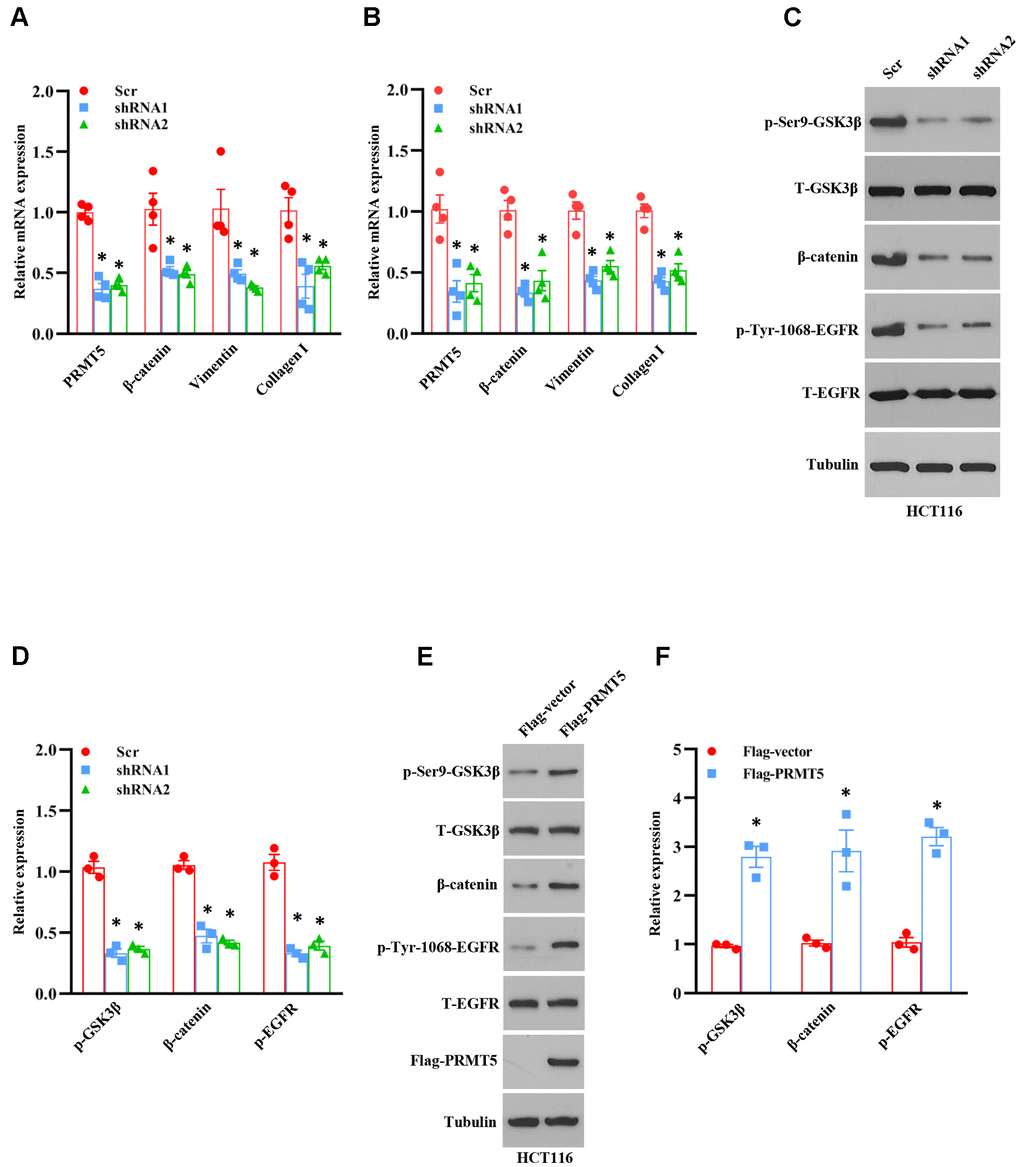 The emerging evidence has been shown that Akt/EMT signaling axis plays a vital role in human colorectal cancer progression [12]. Nevertheless, the upstream target of these signaling is still unknown and not well characterized. According to the above results, we wondered whether PRMT5 was involved in the EMT via activation of Akt in colorectal cancer. To this end, the EMT markers were measured by qRT-PCR using PRMT5 depletion cell lines. As shown in Figure 5A, 5B, the mRNA expression level of β-catenin, vimentin, and collagen I was dramatically reduced in HCT116 and SW480 cells when PRMT5 was down-regulated by shRNA, indicating that PRMT5 is engaged in EMT progression. GSK3β is the most critical downstream target of Akt and controls β-catenin stability, which is involved in EMT [13, 14]. To further investigate the function of PRMT5, we detected the protein expression level of phospho-GSK3β and β-catenin by Western blotting in PRMT5 silencing cells. As shown in Figure 5C, 5D, we found that phospho-GSK3β and the β-catenin protein expression level was markedly decreased, whereas the total GSK3β was unchanged. These results indicate that PRMT5 regulates EMT through Akt/GSK3β signaling in colorectal cancer. Epidermal growth factor receptor (EGFR) acts as a receptor tyrosine kinase (RTK) that regulates cell growth, metabolism, invasion, migration, survival, and EMT via activation of the PI3K/Akt signaling pathway [15, 16]. A recent study has been reported that PRMT5 promotes EMT via EGFR in pancreatic cancer cells [17]. We further evaluate the EGFR expression in PRMT5 silencing cells. We found that phospho-EGFR was significantly impaired, whereas the total EGFR was unchanged (Figure 5C, 5D), suggesting that PRMT5 regulates EGFR activation in colorectal cancer. In order to confirm our results, we re-introduce the PRMT5 into the PRMT5 silencing cells. We found that the phospho-GSK3β, β-catenin, and phospho-EGFR were recovered in HCT116 cells (Figure 5E, 5F), indicating that PRMT5 indeed regulates EGFR/Akt/GSK3β signaling cascades. Altogether, our findings reveal that PRMT5 controls EMT through activation of the EGFR/Akt/GSK3β signaling pathway in colorectal cancer cells.
