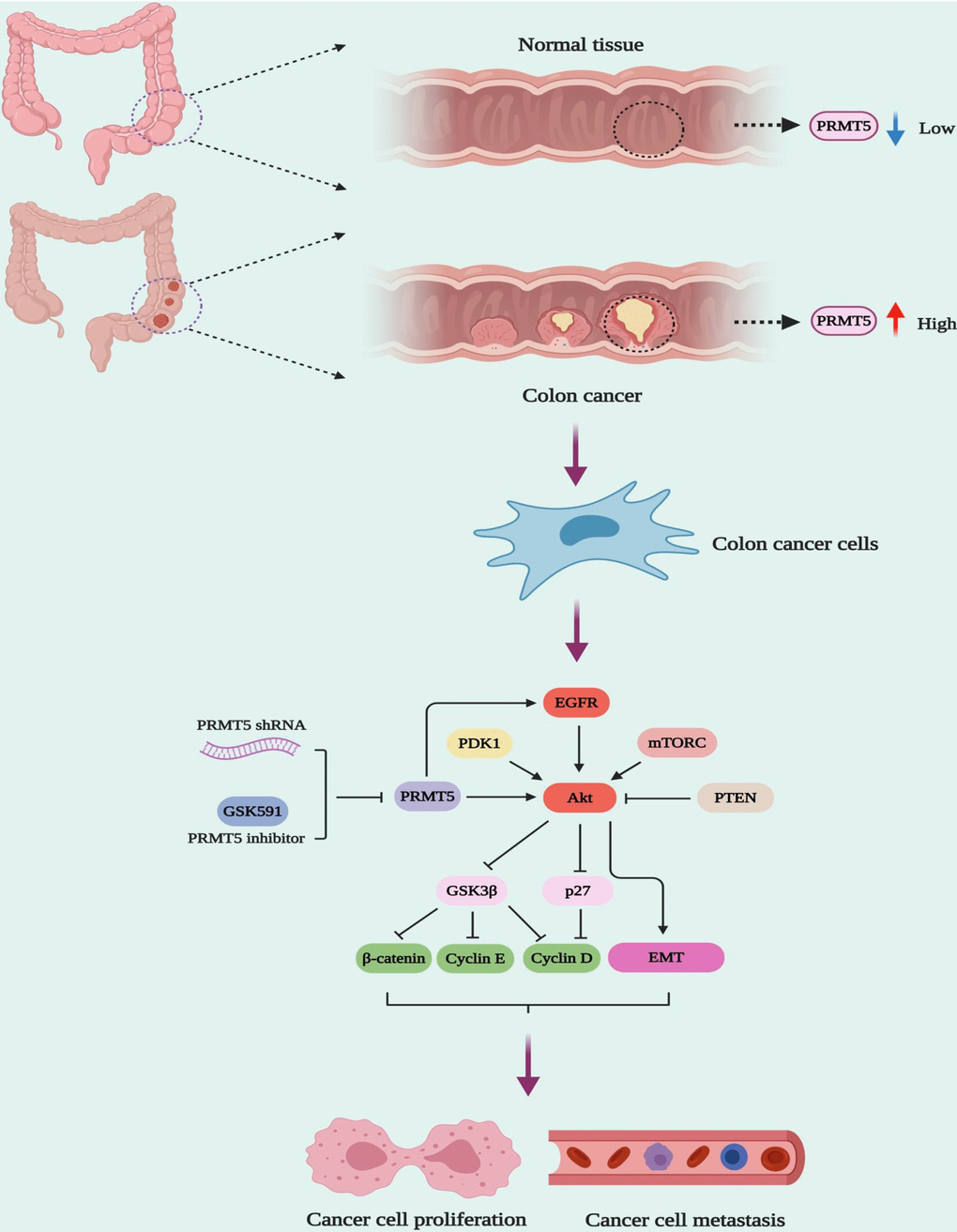 So far, it has been reported that PRMT5 acts as an oncoprotein and plays a crucial role in different types of human cancer via regulation of specific downstream targets or signaling cascades. Nevertheless, it is completely unknown whether PRMT5 is engaged in human colorectal cancer cell proliferation and EMT. Besides, the related molecular mechanism is also unclear. In the current study, we confirm that PRMT5 is frequently highly expressed in human colorectal cancer cells and tissues in both mRNA and protein levels (Figure 1). Further studies show that silencing PRMT5 by shRNA or inhibition of PRMT5 by specific inhibitor GSK591 suppresses colorectal cancer cell growth and cell cycle progression, which is closely related to PRMT5 enzyme activity (Figures 2, 3). Moreover, PRMT5 controls human colorectal cancer cell proliferation via the activation of Akt, but not ERK1/2 or PTEN/mTOR signaling pathways (Figure 4). Finally, our findings reveal that PRMT5 promotes EMT through activation of the EGFR/Akt/GSK3β signaling pathway in colorectal cancer cells (Figure 5). These results suggest that PRMT5 expression level, enzyme activity, and its downstream targets could be served as the potential therapeutic candidates for the treatment of human colorectal cancer. Our findings also pose the possibility that PRMT5 promotes colorectal cancer cell growth, cell cycle progression, and EMT via EGFR/Akt/GSK3β signaling axis.