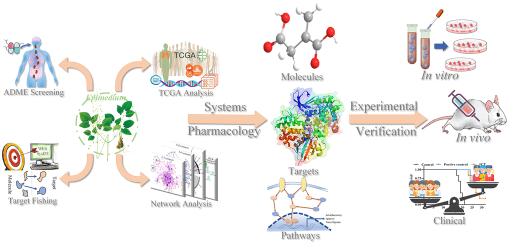 In this work, we used a systems pharmacology approach to elucidate the action mechanism of polypharmacology molecules of Epimedium targeting TME for the treatment of NSCLC. We screened the polypharmacology molecules of Epimedium, predicted the targets of active compounds, constructed the networks, and linked the targets to the immune phenotype in lung cancer patients. These results indicated that polypharmacology molecules of Epimedium targeted several kinds of tumor-related factors and signaling pathways in the TME, such as inflammation, apoptosis, and migration. Additionally, we used in vivo and in vitro experiments to verify the antitumor efficacy of icaritin (ICT), since it is a major active ingredients of Epimedium and was predicted to have a good drug-like and pharmacological properties in targeting the NSCLC immune microenvironment. The LLC tumor-bearing mice model evidenced that tumor volume was significantly reduced and survival time was significantly extended after treatment with ICT. Furthermore, transcriptome sequencing and immunofluorescence showed that ICT could target the TME to upregulate the immune signaling pathway and T cell chemokines, thereby increasing the infiltration of CD8+ T cells to achieve antitumor immunity. In conclusion, systems pharmacology provided an important reference to insight into the action mechanism of polypharmacology molecules of Epimedium targeting TME against NSCLC, and offered a significant strategy for development and application of natural products for immunotherapy. As Figure 1 showed the process flow framework of this study.