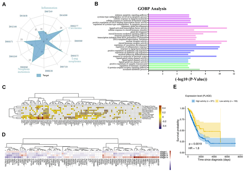 To clarify the potential action mechanism of the multi-target of candidate compounds targeting TME for the treatment of NSCLC. 389 candidate targets for the 16 potential active compounds were obtained by utilizing the similarity ensemble approach (SEA), weighted ensemble similarity (WES) and systematic drug targeting tool (SysDT) methods. After screening, we retrieved 89 potential targets (Table 2 and Supplementary Tables 1, 2). ESR1 and AR are the morphogenetic factors that regulate cell proliferation, differentiation, angiogenesis, and the development of some tumors [32, 33], which were predicted to link the Epimedium to cancer with highest scores. In line with our prediction, studies show that ICT can target ESR1 and AR to control the growth of advanced breast and prostate cancer [24, 34], which confirms the predictive accuracy of our approach. Except for ESR1 and AR, we also predicted many targets related to immune and inflammation with high scores, such as PPARG, PTGS2, PTGS1, ALOX5. In the subsequent study, we mainly focused on these targets. Related studies have shown that regulating the expression of these targets could promote apoptosis and inhibit inflammation in the TME. For example, the COX2 has a variety of biological activities such as inhibiting cell apoptosis, promoting cell proliferation, inhibiting immune surveillance and promoting angiogenesis in the TME, thus playing a key role in the occurrence and development of tumors [35–37]. Therefore, we described the relationship between targets and NSCLC from the following three aspects.