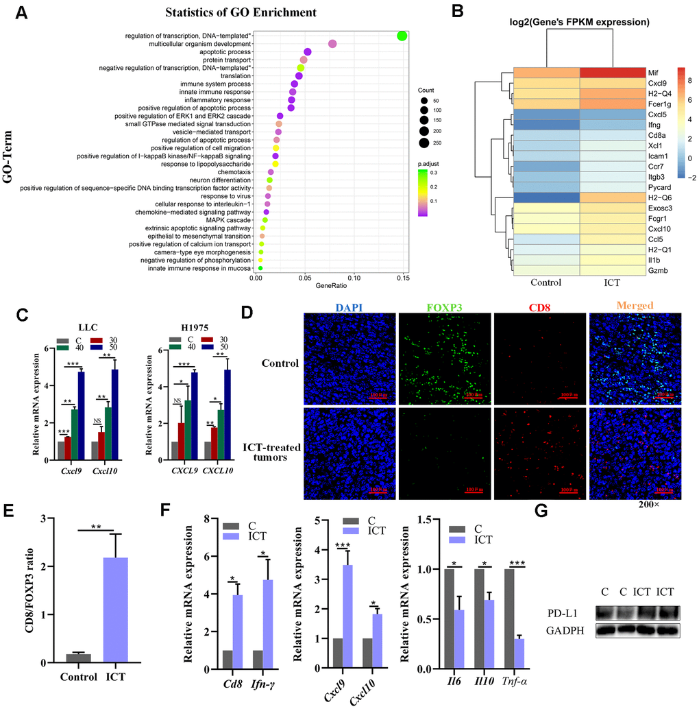 The effects of ICT on H1975 cell viability were determined by measuring the metabolic activity (CCK-8 assay). H1975 cells in the logarithmic phase were seeded in 96-well-plates at a density of 8000 per well and cultured for 24 h. After incubated 24 h, cells were treated with various concentrations of ICT (250, 125, 62.5, 31.25, 15.63, 7.81, 3.9, 1.85, 0 μM) for 48 h. RAW264.7 and H1975 cells have the same experimental protocol. Then, 10 μl of CCK-8 assay was added to each well for 4 h incubation at 37° C and 5% CO2. And the absorbance was detected by a microplate reader (Molecular Devices, California, USA) at 450 nm. Cells treated with medium containing 1% DMSO was regarded as negative control. Three reduplicate wells were used for each treatment and the experiments were performed three times.