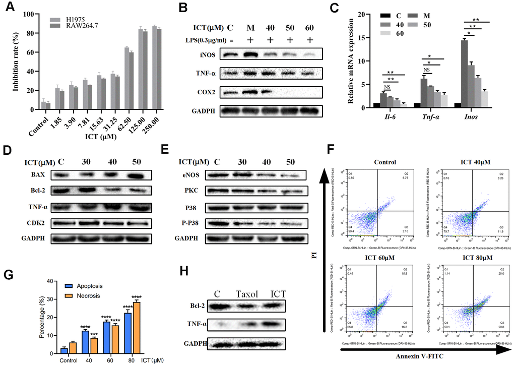 The expression of protein was analyzed using western blotting. Firstly, H1975 or RAW264.7 cells (2×106) were seeded in 150 mm culture dish overnight and treated with the various concentrations of ICT for 24 h. The cells were harvested and scraped, collected by centrifugation and lysed in Qproteome™ Mammalian Protein Prep Kit. The protein concentration was determined using BCA Protein Assay Kit. Secondly, equalized amounts of proteins from each sample separated by SDS-PAGE and transferred onto a PVDF (Millipore, Bedford, MA, USA) membrane. The membrane was washed three times with TBST buffer and blocked with 5% skim milk for 2 h. After washing three times, the membrane incubated with primary antibodies against Bcl-2, Bax, CDK2, eNOS, PKC, p38, p-p38, iNOS, COX2, TNF-α, and GAPDH at 4° C overnight. Finally, the membrane was washed three times again and incubated with a horseradish peroxidase conjugated secondary goat anti-mouse IgG H&L (HRP) for 1 h at room temperature and then washed twice in TBST, once with TBS, afterwards, detected by using the ChemiDoc™ XRS+ Imaging System (Bio-Rad) and labelling were visualized by ImageLab sofware (Bio-Rad). GAPDH was used as the loading control. All of the western blotting experiments were performed at least three times.