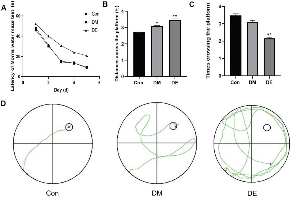 Besides, there was a significant difference in the distances across the platform between CG and DM, as well as the DE group (P < 0.05), whereas no significant difference was reported between the DM group and the DE group (P > 0.05, Figure 1B). The number of rats crossing the platform among the three groups showed a decreasing trend, with no statistical significance (P > 0.05, Figure 1C). The Morris water maze tests showed a confusing trajectory in the DE group, suggesting the rats could hardly find the platform. However, the trajectory of the CG and the DM groups was clear, whereby the rats directly migrated to the platform (Figure 1D).