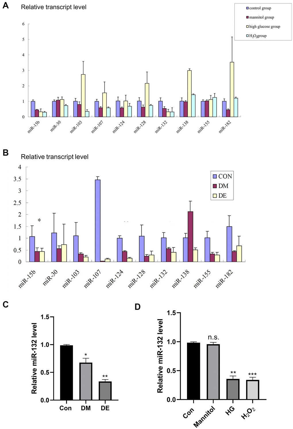 We found a significant difference in miR-132 expression between the CG and DM groups, as well as the DE group in hippocampal tissues (P < 0.01, Figure 2C). Besides, the relative expression levels of miR-132 were lower in primary hippocampal neurons treated with mannitol, high glucose, and H2O2 compared to the control group (P < 0.01, Figure 2D).