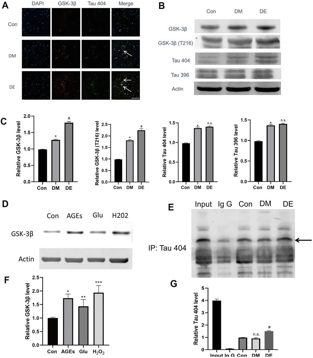 We firstly explored whether there was a binding and colocalized relationship between GSK-3β and Tau 404. Immunostaining results demonstrated that the colocalized relationship was enhanced in Con, DM, and DE groups, progressively (as evidenced by the overplay yellow areas in Merge image, Figure 3A). The IP results showed that there is a binding relationship between GSK-3βand Tau 404, notably, this relationship was enhanced in DM and DE groups (Figure 3E, 3G). Furthermore, GSK-3β and Tau 404 were highly expressed in Con, DM, and DE groups, progressively (Figure 3A, Supplementary Figure 2). Following immunoblot analysis, the expressions of GSK-3β, GSK-3β(T216), and Tau 404 were high in Con, DM, and DE groups, progressively (Figure 3B, 3C). However, the expression levels of Tau 396 and Tau 404 were similar between DM and DE groups (Figure 3B, 3C). In vitro analysis (mimicking) also demonstrated that the expression levels of GSK-3β were higher in Glu, AGEs, and H2O2 groups, than that of Con in HT-22 cells (Figure 3D, 3F).