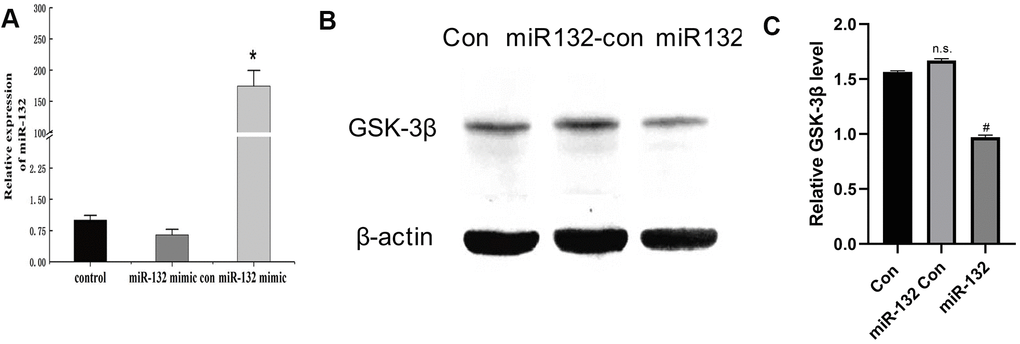 Glycogen synthase kinase-3β (GSK-3β), firstly isolated from rabbit skeletal muscle, is one of the few protein kinases that are inactivated via phosphorylation [27] (Supplementary Figure 1), it phosphorylates glycogen synthase involved in blood glucose regulation. Notably, the high expression of GSK-3β is correlated with insulin resistance and insulin deficiency. On the other hand, Alzheimer’s disease (AD), a neurodegenerative disease that is pathologically characterized by typically senile plaques (SPs) formed from Aβ deposition, and neurofibrillary tangles (NFTs) composed of tau hyperphosphorylation [28]. GSK-3β plays an important role in the hyperphosphorylation of microtubule-associated protein Tau, one of the pathological features in AD. Based on a recent literature report, GSK-3β is potentially involved in the pathogenesis of DE. This has shifted much attention from researchers to explore the association of GSK-3β with the occurrence of DM [28]. In the present work, we explored whether miR-132 potentially downregulates the expression of GSK-3β in injured HT-22 cells.