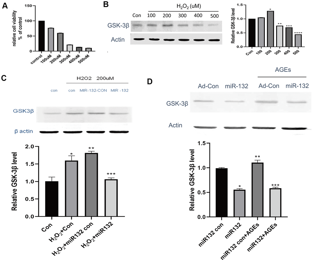 In this experiment, synthetic miR-132 mimics, miR-con, and miR-132. were transfected into HT-22 cells (Figure 4A). Compared to the CG and miR-132 mimics, the expression level of GSK-3β was lower (P < 0.05, Figure 4B, 4C). Then, we optimized the concentration of H2O2 and AGEs in HT-22 cells and found that the relative cell viability was nearly 60% under 200 μM H2O2, which contributed to the cellular stress state [32] (Figure 5A). Moreover, the expression levels of GSK-3β was highest under treatment of 200 μM H2O2 (Figure 5B). miR-132 could reverse the upregulated levels of GSK-3β under the treatment of H2O2 and AGEs (Figure 5C, 5D).