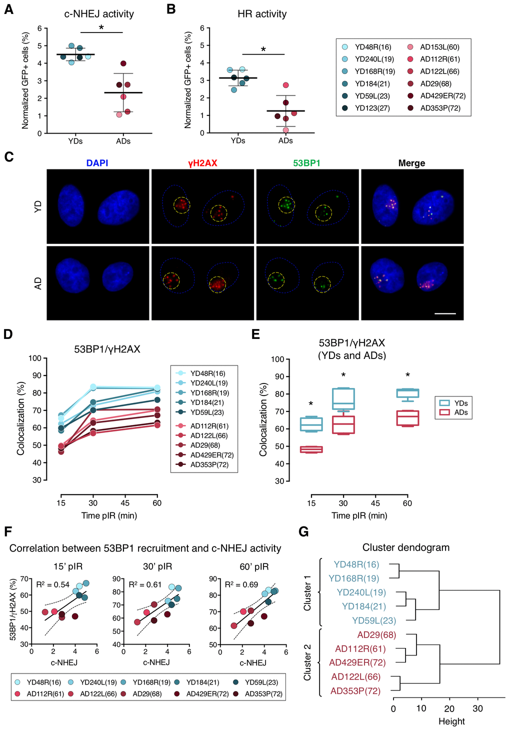 An age-related impaired recruitment of 53BP1 to DSBs could account for the delayed firing of the DDR and the increased frequency of residual breaks previously reported in AD cells as well as for the reduced efficiency of the c-NHEJ pathway observed in the present study. Frequencies of 53BP1 recruitment to DSBs for each donor positively correlated with values of c-NHEJ efficiency evaluated with the plasmid reporter system at all time points analyzed (R2 = 0.54 at 15 min; R2 = 0.61 at 30 min and R2 = 0.69 at 60 min pIR) (Figure 1F). Also, 53BP1 recruitment to DSBs at 60 min pIR negatively correlated with the frequencies of γH2AX foci in HMECs from the same donors reported previously [26] both in non-irradiated samples (R2 = 0.76) and 24 h after irradiation (R2 = 0.79) (Supplementary Figure 2), indicating that proper recruitment of 53BP1 favors γH2AX foci clearance. Finally, data from the 53BP1/γH2AX colocalization at the different time points hierarchically clustered donors into two differentiated groups that coincided with chronological age (Figure 1G), revealing that the frequency of DSBs signaled by 53BP1 is a good marker of age. Altogether, these results indicate that 53BP1 recruitment to DSB sites soon after DNA damage induction is impaired in the HMECs from aged donors, and it translates into a lower activity of the c-NHEJ and into an increased frequency of both basal and induced γH2AX foci.