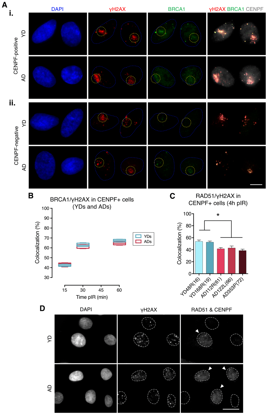 Next, we assessed BRCA1 recruitment to radiation-induced DSBs by quantifying colocalization of BRCA1 with γH2AX foci in G2 cells identified by positive CENPF staining, a protein that progressively accumulates from the S phase to mitosis (Figure 2A, panel i). BRCA1 recruitment kinetics followed a pattern resembling that of 53BP1: it increased with time after micro-irradiation in both YDs and ADs, reaching a plateau at 60 min pIR. Nevertheless, there were no detectable differences in the percentage of BRCA1/γH2AX colocalization between the two age groups (YDs: 42.55% at 15 min, 62.67% at 30 min and 67.42% at 60 min; ADs: 43.04% at 15 min, 61.87% at 30 min and 64.84% at 60 min; two-way ANOVA and Bonferroni multiple correction test; p-value > .05) (Figure 2B; Supplementary Table 3). Given that BRCA1 recruitment to DSBs in G2 cells from ADs was as effective as in those from YDs, we ruled out an age-associated deficiency in BRCA1-mediated DSB recognition. However, difficulties related to the recruitment of other effector proteins downstream of BRCA1 could account for the reduced activity of the HR repair pathway in cells from older donors. Indeed, ADs showed reduced percentages of RAD51 colocalization with γH2AX foci in G2 cells at 4 h after exposure to 5 Gy of γ-rays (53.37% in YD vs. 40.91% in AD; one-way ANOVA and Tukey multiple correction test; p-value < .05) (Figure 2C, 2D). Altogether, the results suggest that an impaired or delayed RAD51 recruitment to DSBs could affect the proper progression of homologous recombination repair with age and account for the decreased efficiency of the HR pathway detected with the plasmid reporter assay in cells from older donors.