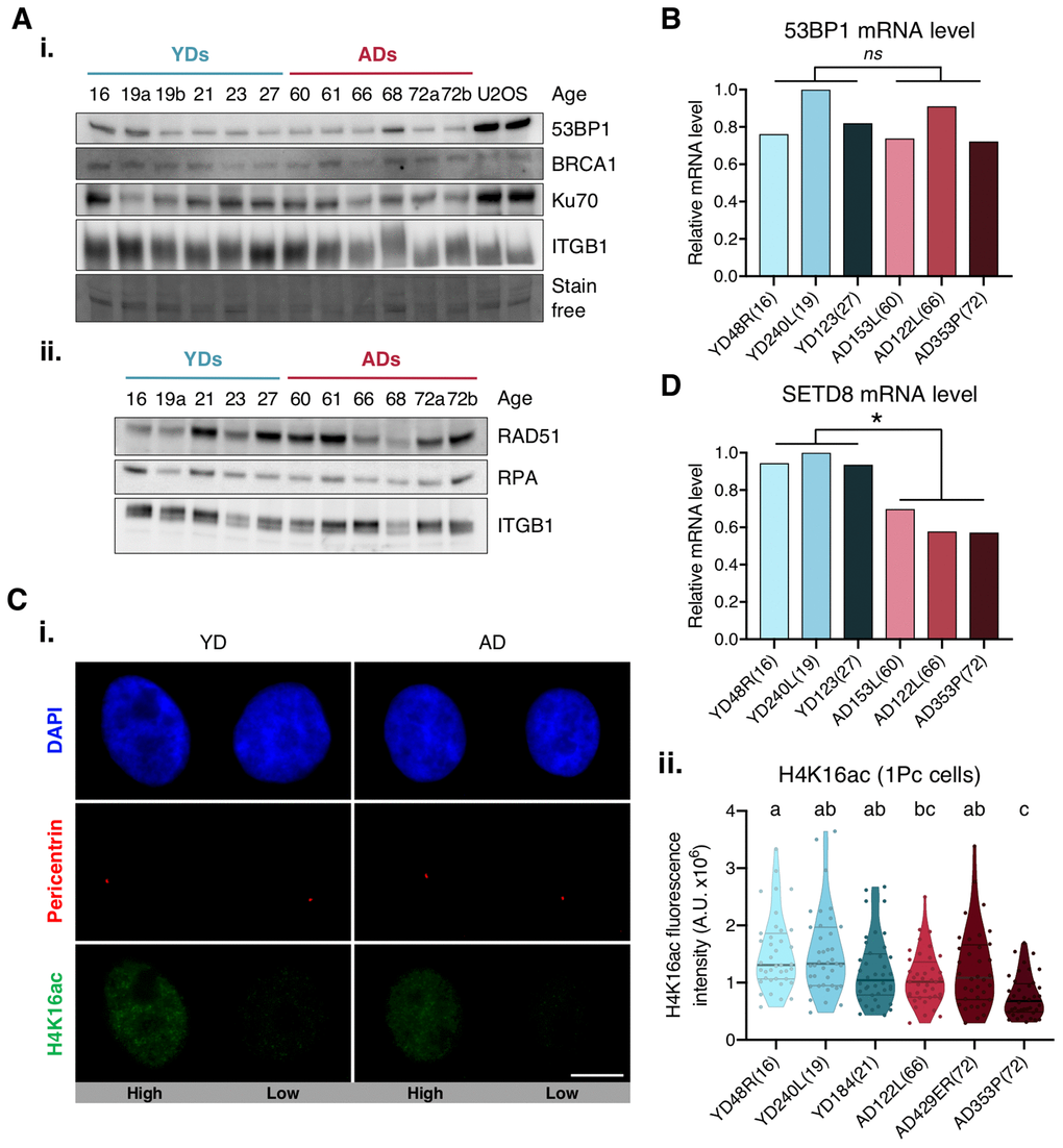 We next aimed to explore the causes underlying deficient recruitment of repair proteins in HMECs from older individuals. Our first hypothesis was that protein expression was differentially regulated by age. Since the expression of DNA repair enzymes has been evaluated in cells from aged individuals and senescent cells with inconsistent results [6, 28], we measured 53BP1 gene expression by RT-qPCR and protein levels by Western blot in HMECs from old and young donors. Although some variation was detected amongst donors, no significant differences in 53BP1 mRNA and protein levels were observed between the two age groups (Figure 3A, panel i, and 3B). Likewise, Western blot results showed no age-related differences for 53BP1’s effector protein Ku70, or for other proteins directing repair to the HR, like BRCA1, RPA and RAD51. Again, the levels of these proteins showed inter-individual variations, but no age-associated tendency was detected (Figure 3A). Thus, we conclude that the decline in c-NHEJ and HR repair and the recruitment defect observed in ADs is not due to depletion of DNA repair proteins.
