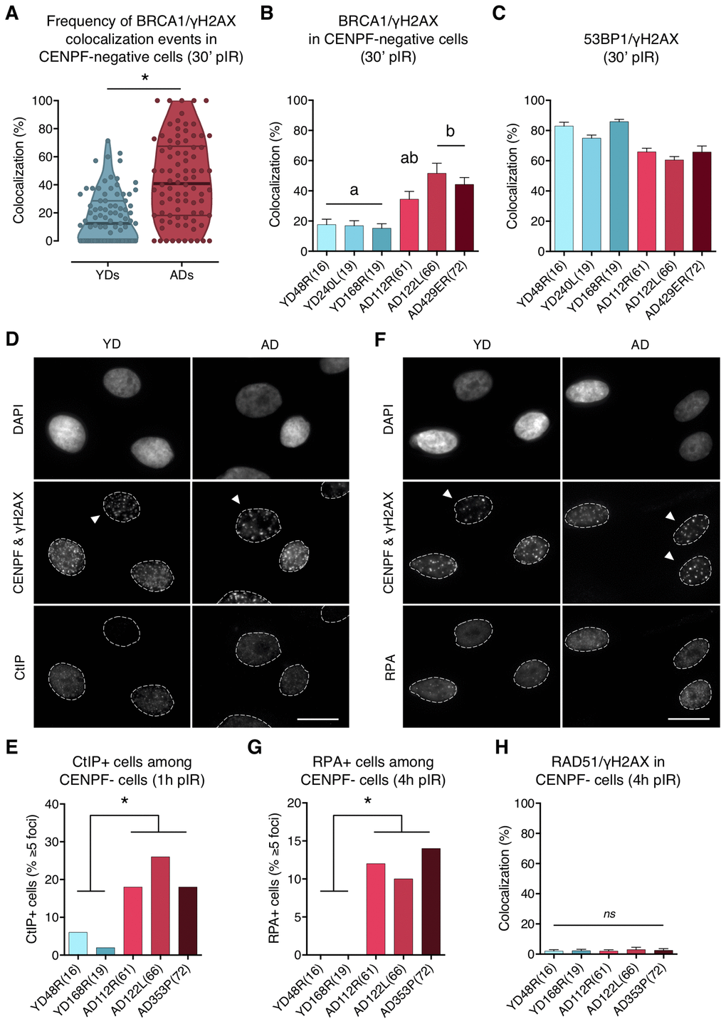 To further explore the functional relevance of the BRCA1 ectopic recruitment observed in G1 cells from ADs, we analyzed whether CtIP was also being recruited. To this end, HMECs from YDs and ADs were exposed to 5 Gy of γ-rays and the number of G1 cells positive for CtIP (≥ 5 foci) was scored. At 1 h pIR, ADs showed a significantly increased frequency of CtIP-positive cells (< 6% in YDs vs. > 15% in ADs; Fisher’s exact test; p-value < .05) (Figure 4D, 4E). These results suggest that, although not all of the γH2AX foci colocalizing with BRCA1 had efficiently recruited CtIP, a significant fraction of DSBs in AD cells eventually did and might undergo end resection.