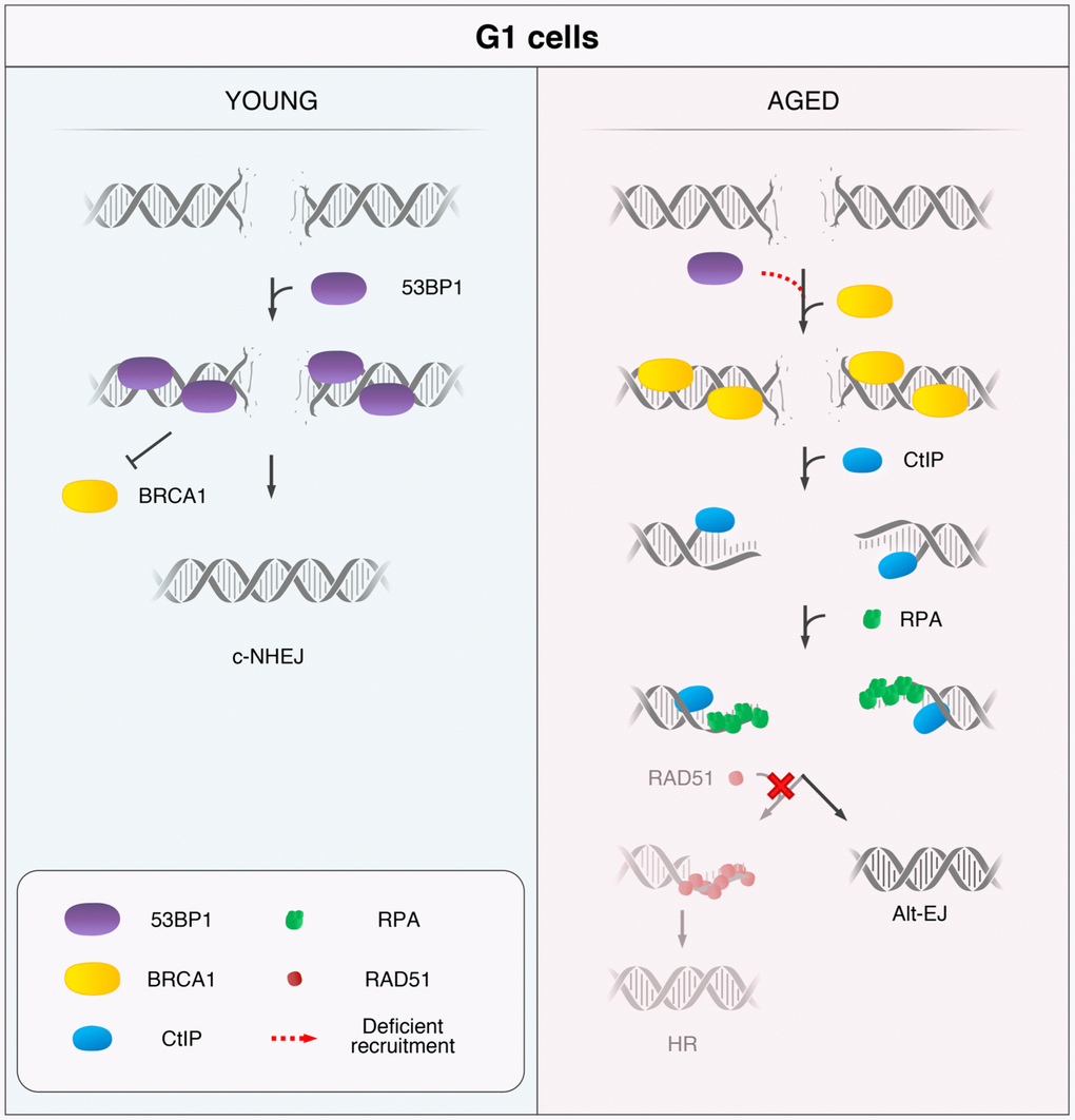 In a previous work from our group, we measured the frequency of γH2AX foci in G1 human mammary epithelial cells (HMECs) from young and aged donors after exposure to γ-rays [26]. Results of that work showed that an age-associated delay in the firing of the DNA damage response (DDR) was responsible for the repair deficiency observed in HMECs from older women [26]. In order to find out the exact nature of this repair defect, in the present work we evaluated the activity of the c-NHEJ and HR repair pathways and the dynamics of the main proteins involved in these mechanisms after DSB induction. We observed a deficiency in the recruitment of 53BP1 to DSBs in cells from aged donors. Absence of 53BP1 from some DSBs in G1 cells allows ectopic access of BRCA1, CtIP and RPA but not RAD51 to these breaks. We propose that increasing age hampers proper recruitment of 53BP1 to G1 DSBs. This defect is probably influenced by changes in the epigenetic landscape affecting the aging genome, such as H4K20 methylation, directly involved in the recruitment of 53BP1. DSBs devoid of 53BP1 are accessible to the DNA-end resection machinery, thus switching DSB repair from c-NHEJ to error-prone mechanisms such as Alt-EJ, which could contribute to the reported age-associated formation of genomic rearrangements.