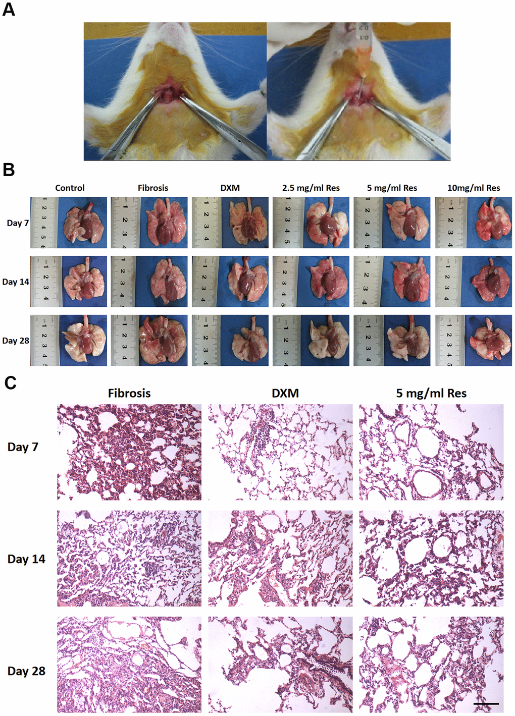 We first successfully established a BLM-induced pulmonary fibrosis model in rats by administering BLM (5mg/kg) intrathecally (Figure 1A). After the rats were sacrificed, the lungs were studied for physical appearance. The lungs appeared the same at each time point in the control group—ruddy with a smooth surface, soft and uniform texture, and no bleeding spots on the surface. In the model group, the lungs appeared dark red on day 7, with increased volume and scattered bleeding spots on the surface. The lungs were gray and white on day 14, with a few nodules of varying sizes and old bleeding spots. The lungs turned pale on day 28 with reduced volume and increased hardness. Nodules and rope-shaped grooves, with partial consolidation, were present on the surface. The observations in the low-Res group were the same as those in the model group. In the middle-Res group, the lungs were dark red on day 7, with slightly increased volume and scattered bleeding spots on the surface. The lungs were slightly red on day 14 with old bleeding spots; there was no change in the volume of the lungs on day 28. The surface was not smooth and had small scattered nodules. There was no hardening and consolidation. The observations in the high-Res and dexamethasone (DXM, positive control) groups were the same as those in the middle-Res group (Figure 1B). Histological analysis using hematoxylin and eosin (H&E) staining was performed to study the pathological changes in the lungs. Alveolar inflammation was observed on day 7 in the model and low-Res groups. Numerous inflammatory cells were observed exuding the alveolar cavity, with a small amount of collagen deposition in the lung interstitium. Pulmonary fibrosis, with a small degree of cell infiltration, was noticed on days 14 and 28. Compared with the model and low-Res groups, pathological changes in the lung tissues of rats in high-Res, middle-Res, and DXM groups were less prominent (Figure 1C).