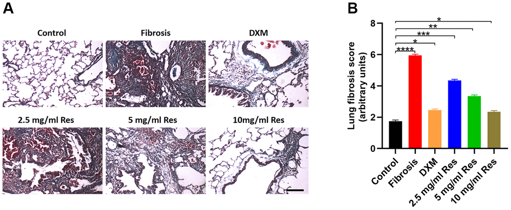 Masson’s trichrome staining revealed thin collagen fibers in the bronchial wall in the control group, with a small amount of collagen fiber deposition between the alveolar walls. In the model and low-Res groups, collagen fibers were largely distributed around the bronchi and small blood vessels, with no visible collagen fibers in the alveolar space on day 7. Collagen fibers around the bronchi and small blood vessels increased on day 28. Several interstitial collagen fibers were observed to be distributed in sheets and bundles, with some alveolar cavities even filled with collagen fibers. Compared with the model and low-Res groups, less prominent pathological changes in lung tissues were observed in middle-Res, high-Res, and DXM groups (Figure 2A). Statistical analysis of these findings indicated that resveratrol improved the lung fibrosis score (Figure 2B).