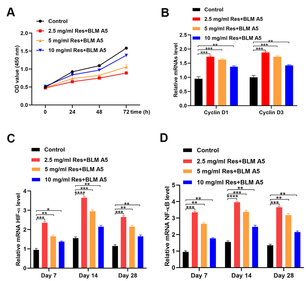 As shown by the CCK-8 proliferation assay, the proliferation of Beas-2B cells decreased with an increase in the resveratrol dose (Figure 3A). We next determined the expression of Cyclin D, a proliferation-related gene, following different treatments, and observed that resveratrol reduced Beas-2B cell proliferation (Figure 3B). Moreover, the qRT-PCR results showed a negative correlation between the expression of HIF-1α and NF-κB and resveratrol dose (Figure 3C, 3D).