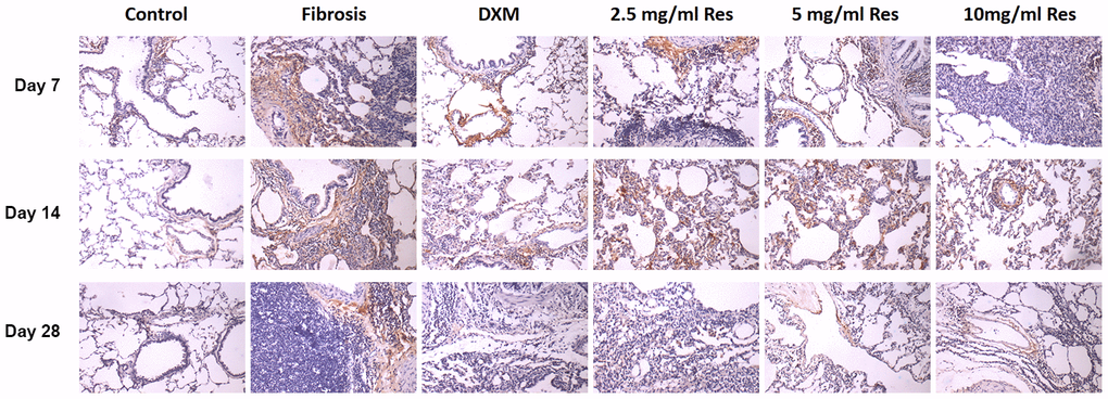 Under normal physiological conditions, HIF-1α is weakly expressed in lung tissues. It was expressed around small blood vessels, and in some inner macrophages and inflammatory cells in the lung interstitium in the model group, mainly located in the cytoplasm. The number of HIF-1α-positive cells in the model, high-Res, middle-Res, low-Res, and DXM groups was higher than that in the control group. Their number was markedly different between the model group and low-Res, middle-Res, and high-Res groups, and the DXM group on day 7 (p < 0.05). However, no difference was observed in HIF-1α-positive cells between middle-Res, high-Res, and DXM groups on day 7 (p > 0.05). No difference was observed between low-Res, middle-Res, and model groups on day 14 (p > 0.05). The expression of HIF-1α in the high-Res and DXM groups was weaker than that in the model, low-Res, and middle-Res groups on day 14 (p < 0.05). However, no difference was observed between DXM and high-Res groups on day 14 (p > 0.05). Similarly, no major difference was observed between different Res intervention groups on day 28 (p > 0.05), and this difference was less than that in the model group (p <0.05) and higher than that in the DXM intervention group (p < 0.05; Figure 4 and Table 1).