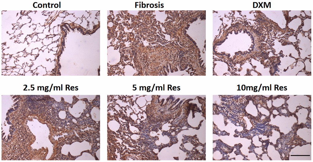Under normal physiological conditions, NF-κB is weakly expressed in the lungs. The positive light brownish yellow staining primarily around the bronchi and in certain interstitial macrophages and inflammatory cells was evidence of NF-κB expression. The number of NF-κB-positive cells in the model, high-Res, medium-Res, low-Res, and DXM groups was higher than that in the control group. Reduced expression of NF-κB was observed in middle-Res, high-Res, and DXM groups than in the model and low-Res groups on days 7, 14, and 28 (p < 0.05). We did not find any difference in the expression of NF-κB between middle-Res, high-Res, and DXM groups on days 7, 14, and 28 (p > 0.05; Figure 5 and Table 2).