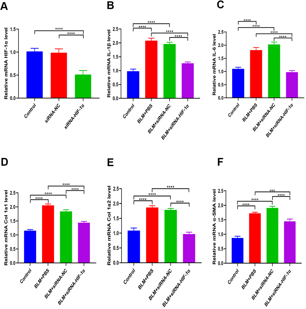 Expression of HIF-1α in BEAS-2B cells with and without siRNA-HIF-1α transfection was measured with qRT-PCR. The results showed that HIF-1α levels in the cells expressing siRNA-HIF-1α was significantly lower than in the control and siRNA-NC groups (Figure 6A). Moreover, the in vitro results suggested that the high levels of fibrotic (Col 1a1, Col 1a2, α-SMA) and inflammatory (IL-1β, IL-6) markers induced by BLM were significantly reduced after transfection of siRNA-HIF-1α (Figure 6B–6F).