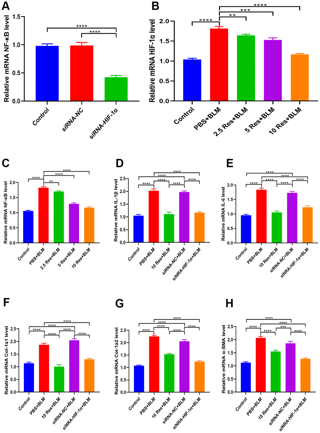 As shown in Figure 7A, qRT-PCR analysis revealed that NF-κB levels were significantly decreased in BEAS-2B cells expressing siRNA-HIF-1α. Likewise, resveratrol suppressed HIF-1α expression in BEAS-2B cells (Figure 7B), and there was a concomitant decrease in NF-κB levels (Figure 7C). Moreover, BLM-induced expression of the inflammatory markers IL-1β and IL-6 was significantly reversed by resveratrol or siRNA-HIF-1α (Figure 7D, 7E). Similarly, BLM-induced expression of the fibrotic markers α-SMA, Col 1a1, and Col 1a2, was significantly reversed by resveratrol or siRNA-HIF-1α (Figure 7F–7H).