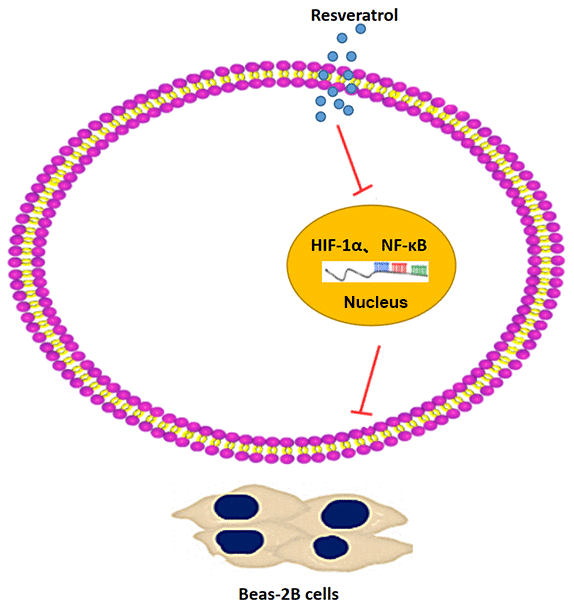 Based on the results of our study, we conclude that resveratrol reduces the inflammatory response and lung damage in pulmonary fibrosis by inhibiting the expression of HIF-1α and NF-κB (Figure 8). Thus, resveratrol could serve as a promising therapeutic drug for pulmonary fibrosis.