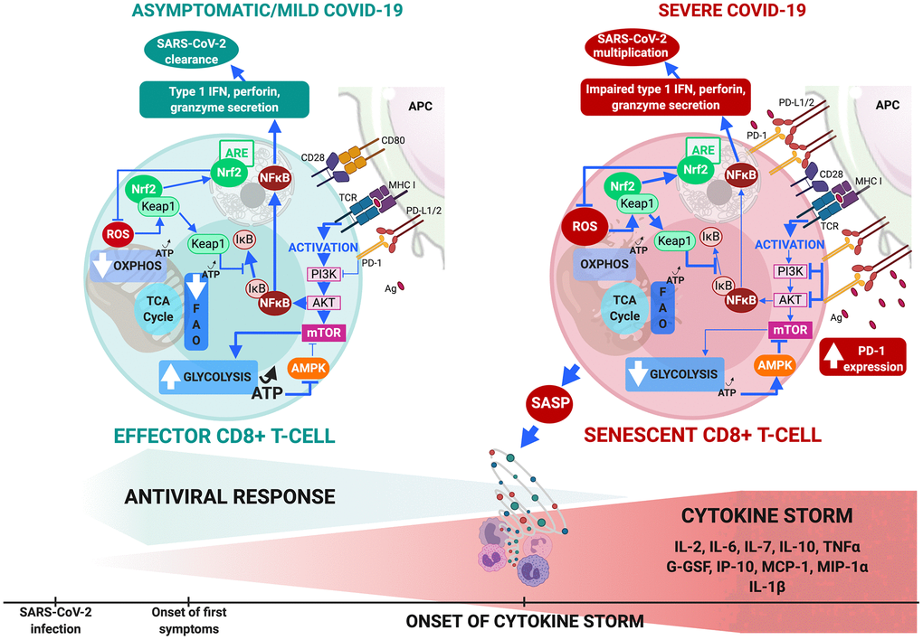Higher ongoing SARS-CoV-2 viral loads cause overstimulation of CD8 T-cells via TCR signaling, inducing CD8+ T-cell senescence [36, 37]. In severe COVID-19, circulating T-cells show signs of senescence by expressing PD-1, Tim-3, CTLA-4 and TIGIT [3, 4, 30, 31]. CD4+ and CD8+ T-cells have been observed in patients over 60 years of age and those receiving ICU care. There is an inverse correlation between decrease in total number of T-cells and patient survival [3]. Moreover, senescent CD8+ T-cells are unable to secrete cytotoxic perforin, granzyme and IFN-γ [4] in these patients.