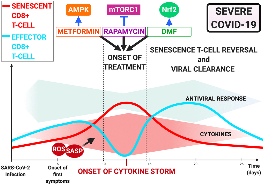 Since mTOR is a downstream signaling molecule in the AMPK pathway [90], metformin combined with rapamycin may offer the possibility of restoring T-cell functionality and preventing severe progression in COVID-19, provided it is initiated early in the cytokine storm phase (Figure 3).