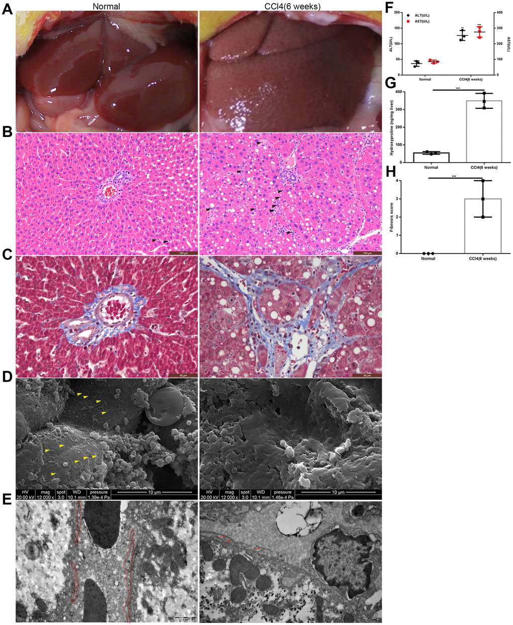 We established fibrotic rat model by the intraperitoneal injection of 50% CCl4 dissolved in oil. Six weeks later, the edge of the liver was blunt, and the hepatic surface was grainy (Figure 1A). Histochemical staining showed numerous inflammatory cells accumulating in the hepatic sinusoids, and collagen fibers were deposited in the space of Disse (Figure 1B, 1C). Scanning electron microscopy (SEM) and transmission electron microscopy (TEM) revealed typical characteristics of liver capillarization, namely defenestration and basement membrane formation (Figure 1D, 1E). The levels of both alanine aminotransferase (ALT) and aspartate transaminase (AST) were significantly higher in fibrotic rats than in normal control (NC) group (Figure 1F). The content of hydroxyproline was approximately 346.5±7.086 ng/mg liver tissue in fibrotic rats, which was much higher than that in NC group (Figure 1G). Moreover, the liver fibrosis score was higher in fibrotic rats than that in normal rats (Figure 1H). Taken together, these results indicated the successful establishment of the liver fibrosis model.