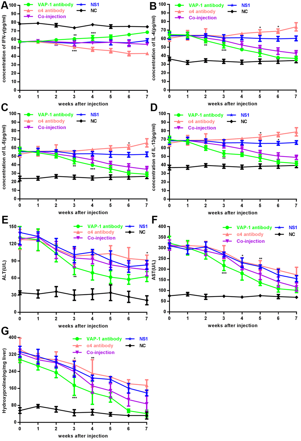 In in vivo experiments, we detected levels of cytokines after the injection of inhibitory antibodies. Through observation for 7 consecutive weeks, we found that secretion of IFN-γ, the signature cytokine of Th1 cells, showed an increasing trend in the anti-VAP-1 group and on the 3rd week after injection, it increased to a significant high level; however, a decreasing trend was observed in the anti-integrin α4 group and the level decreased to a significant low value at the 3rd week after injection. In the co-injection group and the two control groups (irrelevant isotype-matched control antibody group (NS1) and NC), no significant changes were detected over the observation period (Figure 2A). Similarly, the expression of IL-4, IL-5 and IL-13, the signature Th2 cytokines showed decreasing trend in the anti-VAP-1 group but an increasing trend in the anti-integrin α4 group (Figure 2B–2D). Compared with initial level, the transaminase (ALT and AST) dropped to a significantly lower level on the 3rd week in the anti-VAP-1 group, however it showed a much less decreasing extent in the anti-integrin α4 group (Figure 2E, 2F). The hydroxyproline content was initially high in each experimental group; however, on the 3rd week after anti-VAP-1 injection, the content began to decrease significantly. And similarly, the decreasing extent was much less in the anti-integrin α4 group (Figure 2G). To further demonstrate the specificities of anti-VAP-1 monoclonal antibody (mAb) and anti-integrin α4 mAb, we compared each experimental group to the NS1 group according the cytokine level of Th cells at the 3rd week after injection, and the results showed a good specificity (Supplementary Figure 1).