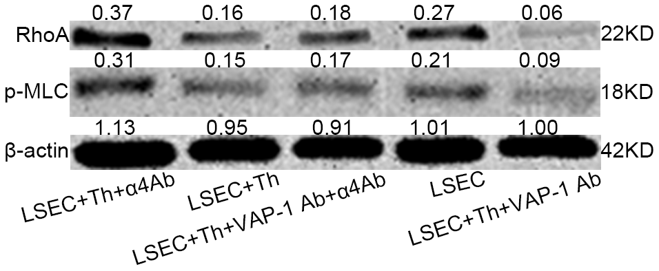 Previous studies have shown that SEF size was regulated by actomyosin [22, 25, 26]; besides, Rho signaling pathway was critical in modulating cytoskeleton [20–22]. Combining the results in this study that blocking interactions between Th lymphocytes and LSECs led to changes of SEF size (Figure 4B, 4C), we hypothesized that Th1/2 cells likely influenced hepatic capillarization through cytoskeletal alterations mediated by the canonical Rho-ROCK-myosin signaling pathway. To prove this reasonable hypothesis, we performed an immunofluorescence confocal microscopy assay by staining F-actin stress fibers and phosphorylated myosin light chain (p-MLC) to elucidate the mechanism underlying the morphological change of fenestrae in in vitro experiments. Isolated LSECs treated with the anti-VAP-1 antibody had lower p-MLC content than that in other experimental groups. In addition, a loss of stress fibers was observed in anti-VAP-1 group compared with that in other experimental groups. However, in the anti-integrin α4 group, p-MLC and F-actin stress fiber content showed the highest levels compared with other groups (Figure 6). To further confirm the light and electron microscopy results and to investigate the role of the Rho-ROCK-myosin pathway in the alteration of SEF, we performed western blot for Rho and p-MLC, the two key proteins of this signaling pathway, and found that expressions of Rho and p-MLC were lower in anti-VAP-1 antibody LSECs but relatively higher in anti-integrin α4 antibody LSECs than other groups (Figure 7).
