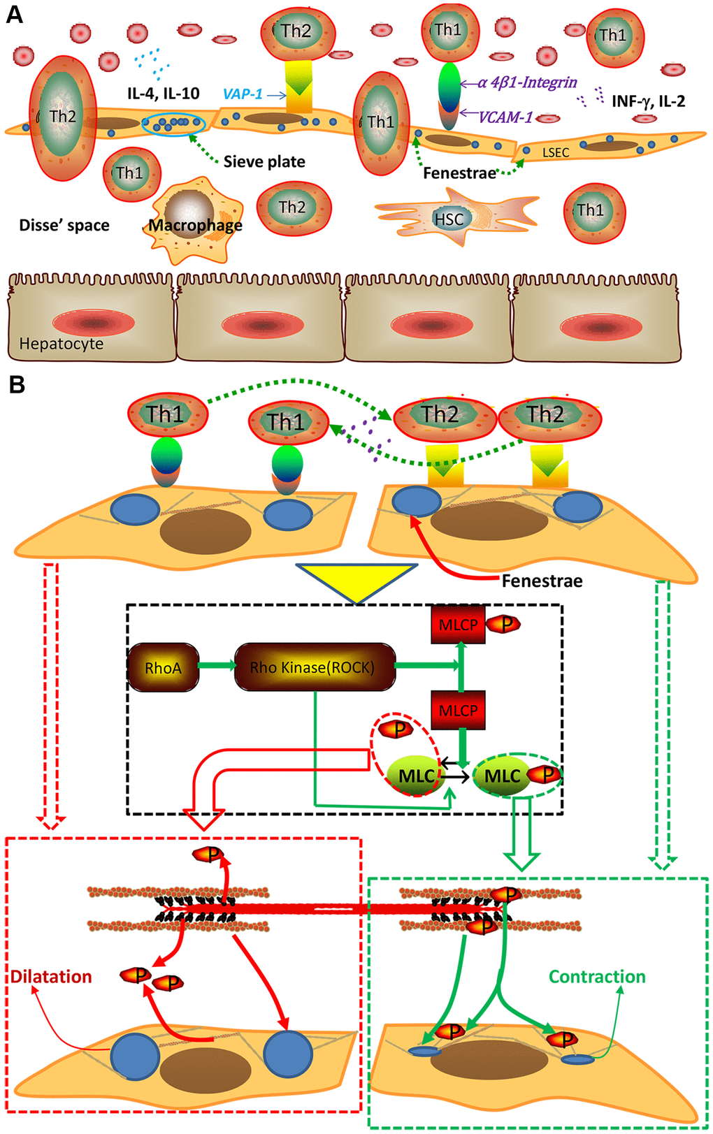 Fenestration, which is characterized by scattered fenestrae on the surface of LSECs, constitutes the unique phenotype of LSECs. Commonly, under long-term exposure to hepatotoxic substances, differentiated LSECs will lose their normal phenotype and transition into another state preceding fibrosis, a process called "capillarization" [33]. Then, lymphocytes recruited into sinusoids, where they interacted with different cells such as LSECs, hepatic stellate cells (HSCs) and hepatocytes to regulate progression from capillarization to liver fibrosis [34–37]. Our study revealed a similar defenestration phenomenon in the fibrotic rat model. However, the stimulus initiating these changes—in other words, the trigger of defenestration—is not yet fully known, although numerous factors, such as aflatoxin [38–40], the c-terminal fragment of thrombospondin-1 (P4N1) [41] and iron overload [42] have been reported as possible causes. Because cytoskeletal changes can alter the size of fenestrae and because the cytoskeleton is regulated by actomyosin (Figure 8B) [22, 25, 26], we explored changes in cytoskeletal signaling after preventing the interaction of Th2 cells with LSECs and found decreased Rho activation and MLC phosphorylation, which caused the subsequent dilatation of cytoskeletal actin around LSECs and alleviated hepatic capillarization (Figure 8B).