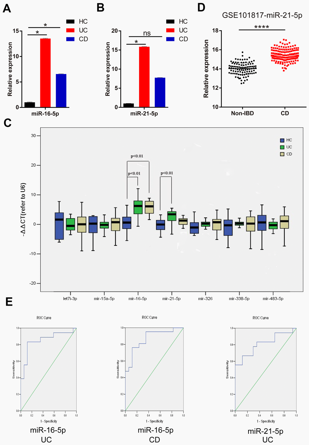 The diagnostic capability of miR-21-5p and miR-16-5p for IBD was verified by Receiver operating characteristics (ROC) curves analysis. It was surprising to find that miR-16-5p showed a great power in diagnosing CD (area under curve (AUC) = 0.868, p < 0.001) and UC (AUC = 0.853, p < 0.001). Besides, the ROC curve analysis of miR-21-5p for the diagnostic accuracy of UC showed an AUC of 0.810 (p < 0.001) (Figure 1E).