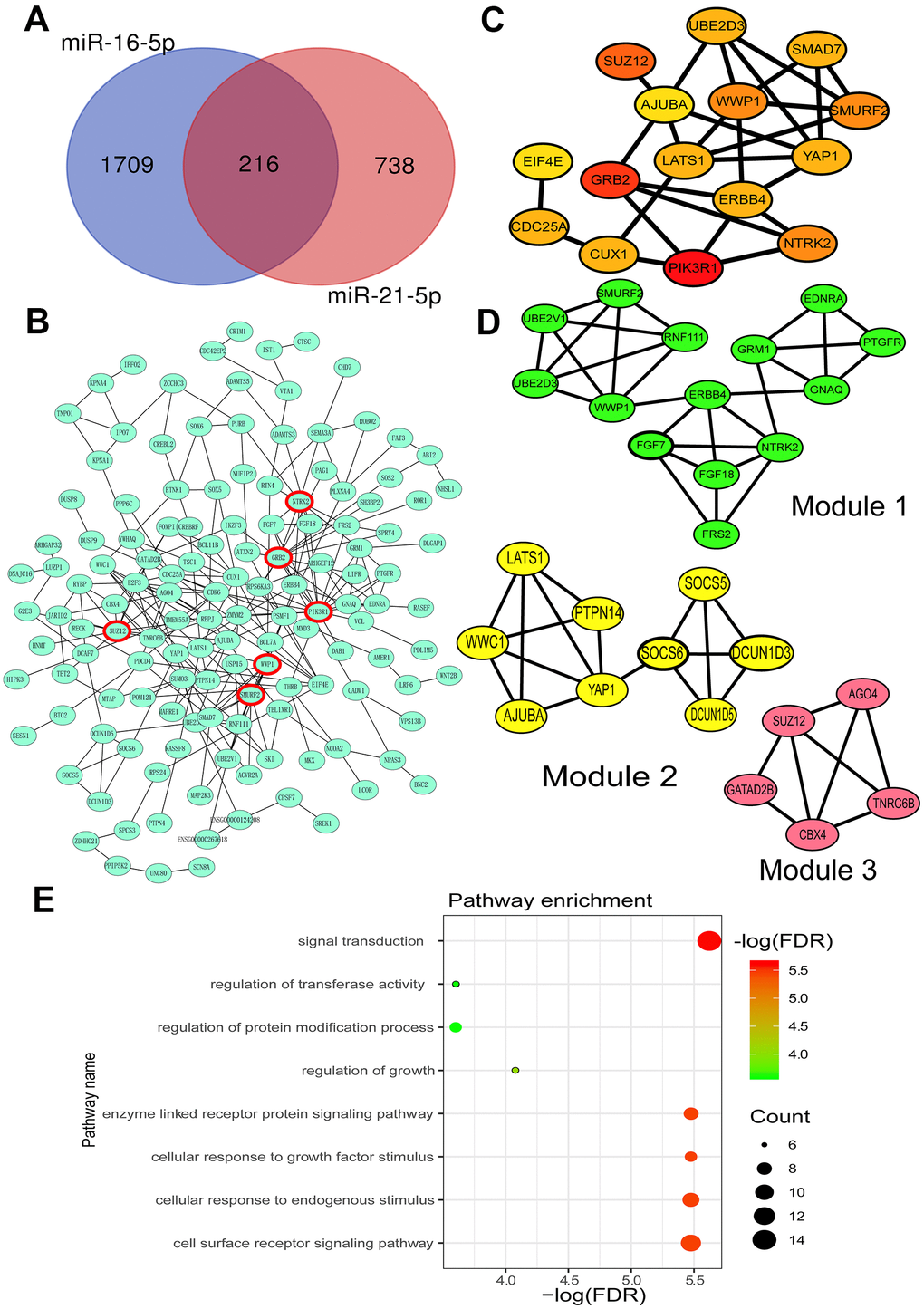 The Search Tool for the Retrieval of Interacting Genes (STRING) database [25] was performed to construct the protein-protein interaction (PPI) network and analyze the interaction between target genes (Figure 2B). Cytohubba, a plug-in of the STRING database, was used to find the top 15 hub genes [26] (Figure 2C). Furthermore, with degree ≥ 10 as the threshold, six genes were selected for further analysis, including phosphoinositide-3-kinase regulatory subunit 1 (PIK3R1), growth factor receptor-bound protein 2 (GRB2), SUZ12 polycomb repressive complex 2 subunit (SUZ12), neurotrophic receptor tyrosine kinase 2 (NTRK2), SMAD specific E3 ubiquitin-protein ligase 2 (Smurf2), and WW domain-containing E3 ubiquitin-protein ligase 1 (WWP1). MCODE was used to select three remarkable modules from the PPI network complex on the basis of the degree of importance [27] (Figure 2D).