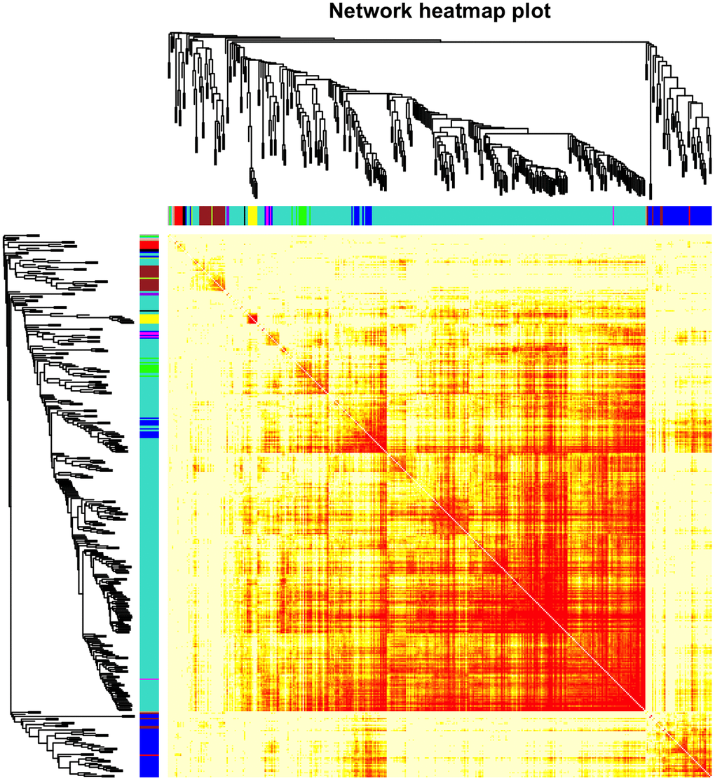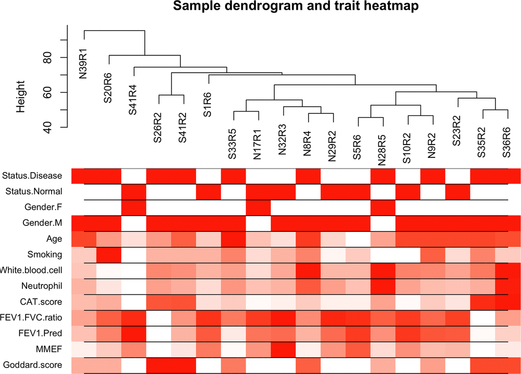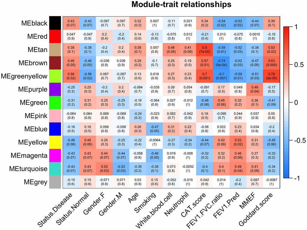 The top 50% most varying genes (n = 9,550) were used for WGCNA network construction. Thirteen types of clinical data, including disease status (COPD vs. control), sex, age, history of smoking, white blood cell count, neutrophil count, smoking (packages per years), FEV1/FVC, FEV1/Pre, maximum mid-expiratory flow (MMEF), CAT score, and Goddard score were evaluated. Genes were divided into modules through hierarchical average linkage clustering if they exhibited similar patterns of expression (Figure 1). To assure relatively balanced mean connectivity and scale independence, the network topology was constructed with various soft threshold powers in order and a soft threshold power of 9 was finally chosen to analyze network topology. Using a dynamic tree-cutting algorithm and 0.25 as the merging threshold function, 13 modules were identified in the dataset (Figure 2). A topological overlap matrix (TOM) plot of the gene network was constructed (Figure 3).