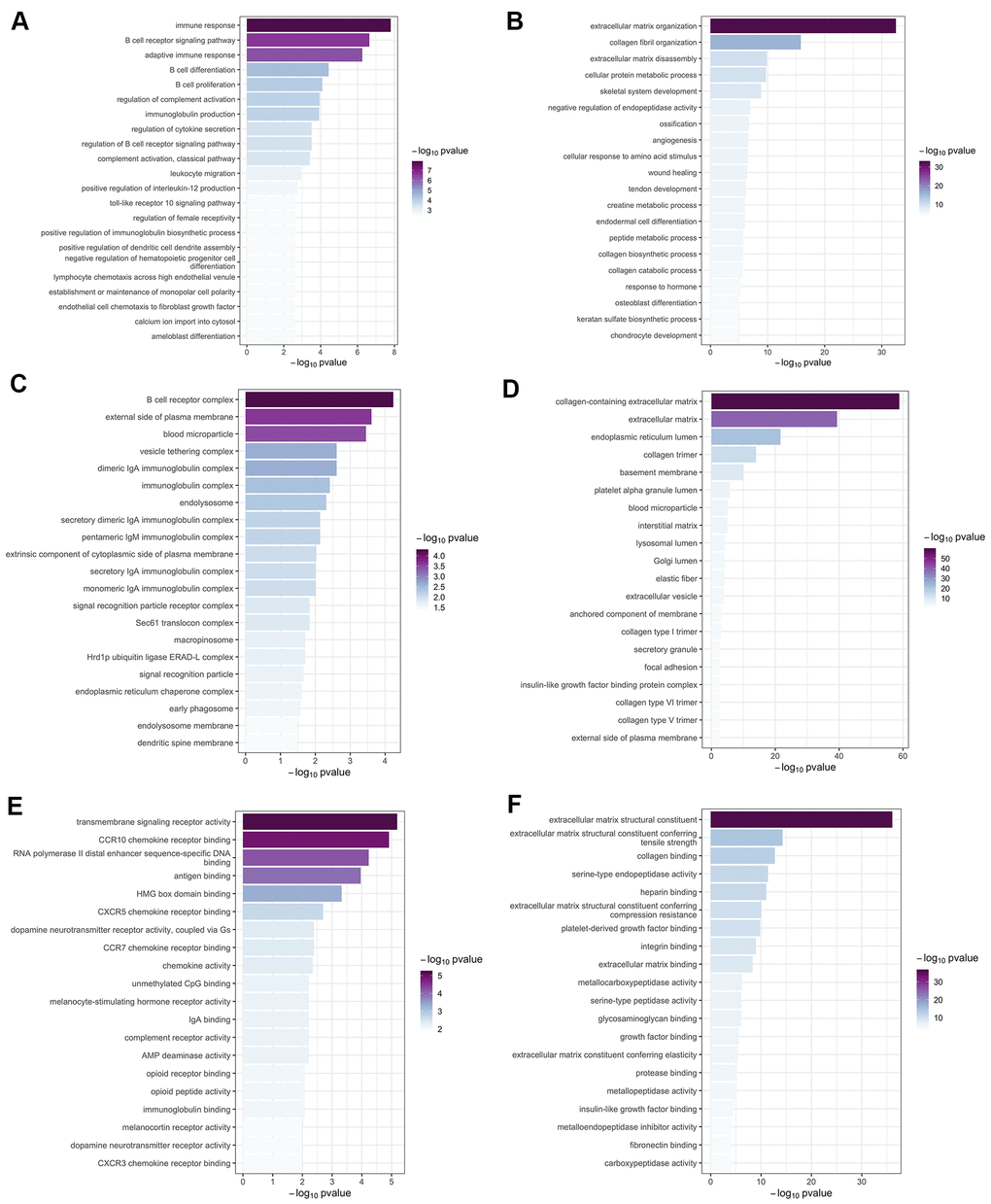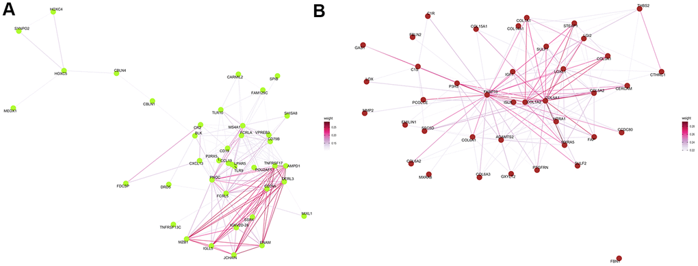 The Cytoscape was used to visualize the top 40 gene connections and to find the hub genes in each module. The top ten hub genes in the green-yellow module were FCRLA, MS4A1, CD19, FCRL5, CD79A, CD79B, PNOC, BLK, POU2AF1, and VPREB3 (Figure 7A). Genes of FKBP10, C1S, HTRA1, ADAMTS2, EMILIN1, LOXL1, COL6A1, PCOLCE, COL5A1, and COL1A2 were the top ten hub genes in the brown module (Figure 7B). In turn, differential expression analysis indicated that the expression of CD79A, VPREB3, LOXL1, BLK, FKBP10, FCRL5, COL1A2, HTRA1, and CD19 was significantly increased in patients with COPD, relative to controls (all P<0.05, Supplementary Figure 1).