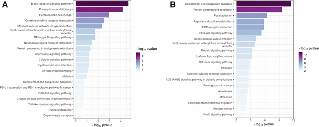 CD19 is a characteristic marker of B cells. Cigarette smoking, one most important risk factor for COPD, is associated with percentage increases in CD19+ B cells, as well as activated B cells, among peripheral blood mononuclear cells [17]. MS4A1, also named as CD20, is an activated-glycosylated phosphoprotein that interacts physically with BCR and other membrane proteins and regulates the development and differentiation of B cells into plasma cells [18]. LncRNA COPDA1 can increase the expression of MS4A1, then to increase store-operated calcium entry in human bronchial smooth muscle cells, promoting their proliferation and airway remodeling [19]. POU2AF1 expression correlates with emphysema severity, suggesting a potential contributing role [16]. Zhou et al reported that enhancing expression of POU2AF1 alleviated the suppression of host defense genes by smoking in human airway epithelial cells [20]. However, the mechanism of POU2AF1 in emphysema needs further research. Although functional studies are needed to validate the present findings, our study provides further evidence that B cell-associated genes and pathways are involved in the emphysema phenotype of COPD.
