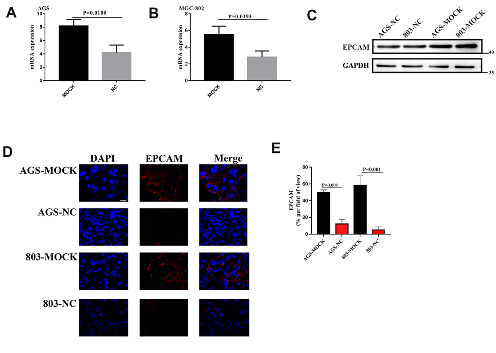 Both MGC-803 and AGS cells were selected from American Type Culture Collection and used within 20 passages. RPMI1640 high glucose medium (Invitrogen) containing 10% calf serum (Gibco) and 100 U/ml penicillin, and 100 mg/ml streptomycin (Invitrogen) was used in an incubator at 37° C and 5% CO2, and cells in the logarithmic growth phase were selected for the experiment. 3×105 cells was placed in a 60mm petri dish, and transfected with Lipofectamine 2000, RNAi Max (Invitrogen) and 100nM siRNA 24 hours later. After 24 hours, the transfection mixture was removed and replaced with normal growth medium. Cells were collected at 72h after transfection (Supplementary Figure 11A–11C).